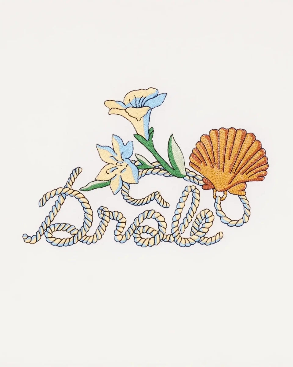 På fronten prydes den af et detaljeret Drôle Coquillage-print, hvor muslingeskaller og blomster flettes ind i brandets logo og skaber et legende, illustrativt udtryk.