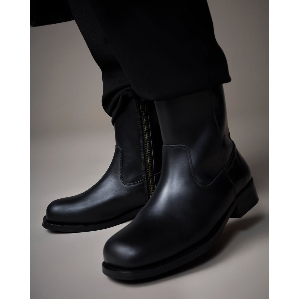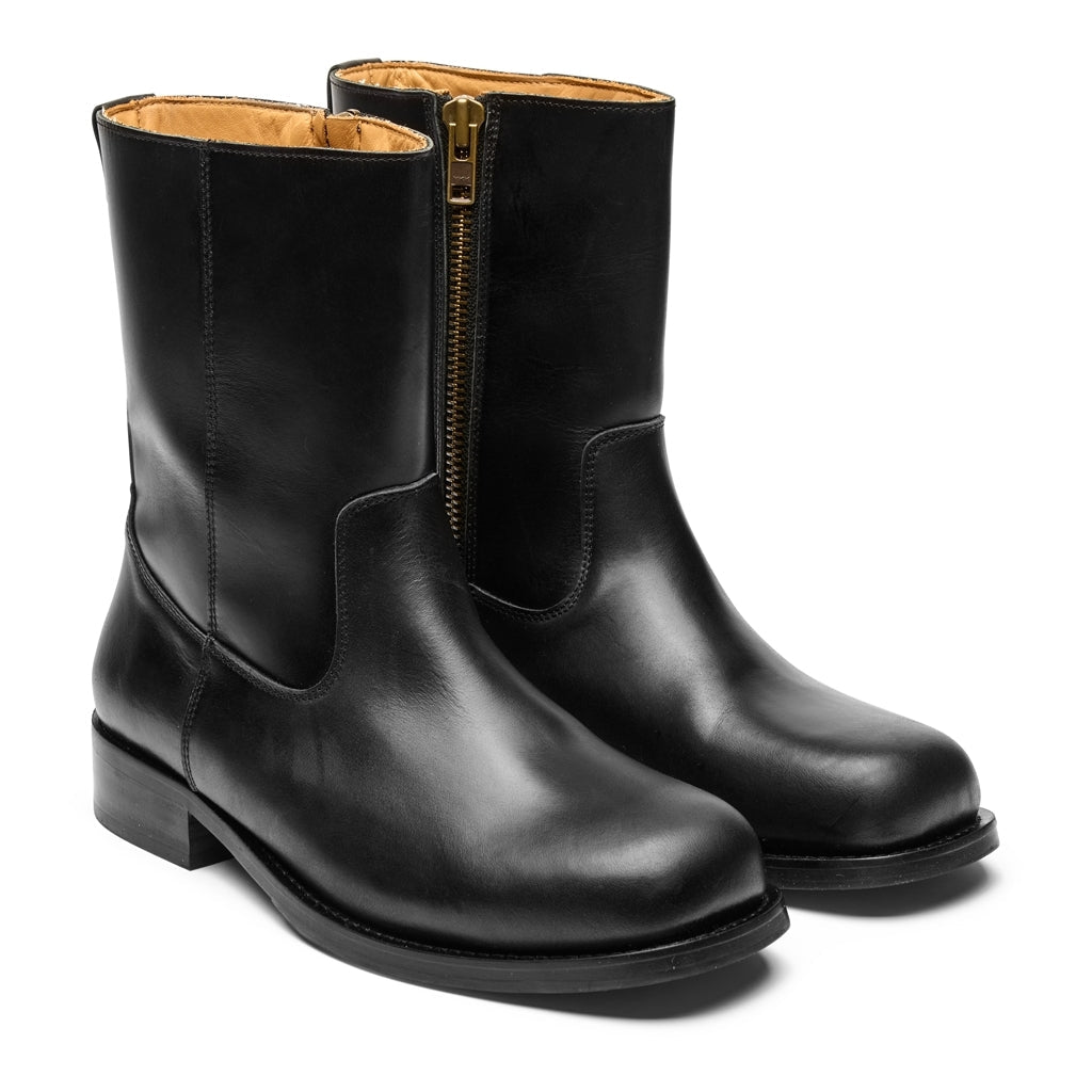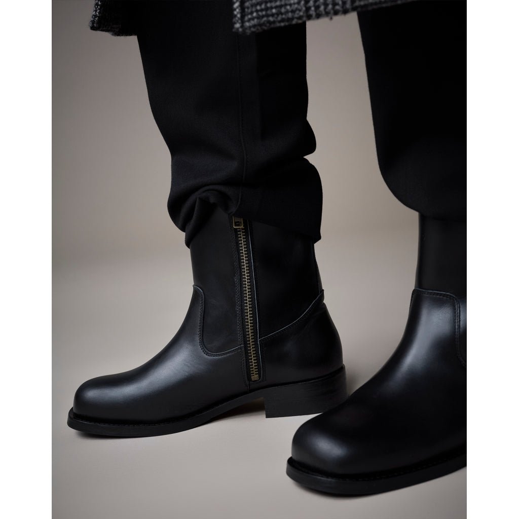 Style Billy støvlen er fremstillet i kraftigt crazy horse læder, der udvikler en smuk patina over tid. Designet kombinerer klassisk western-inspireret stil med moderne komfort. Støvlen har en praktisk lynlås på indersiden, som gør den nem at tage af og på, samt en robust ydersål og polstret indersål for ekstra komfort.