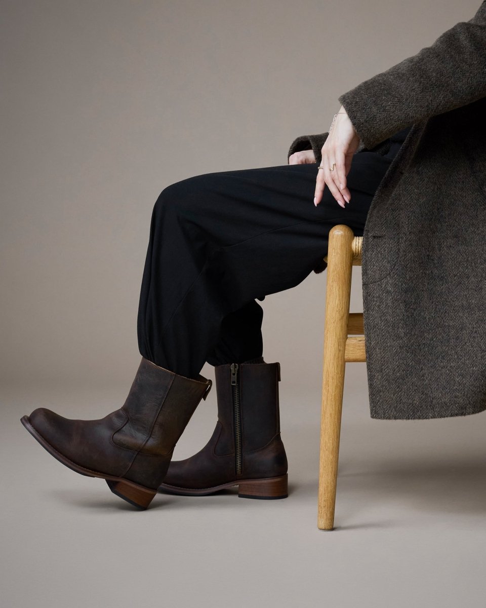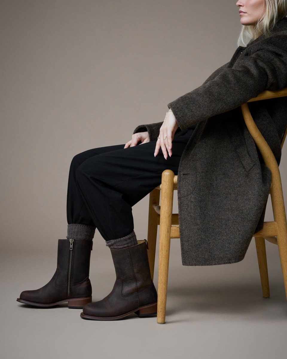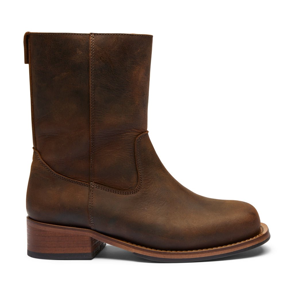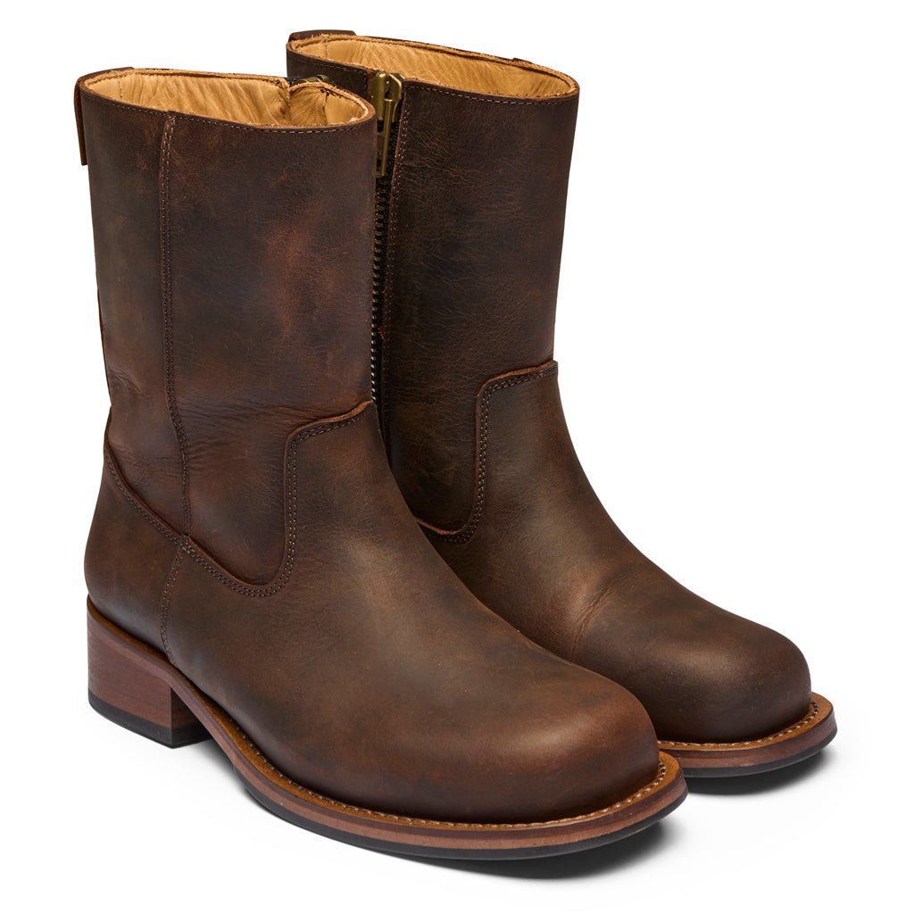 Style Billy støvlen er fremstillet i kraftigt crazy horse læder, der udvikler en smuk patina over tid. Designet kombinerer klassisk western-inspireret stil med moderne komfort. Støvlen har en praktisk lynlås på indersiden, som gør den nem at tage af og på, samt en robust ydersål og polstret indersål for ekstra komfort.