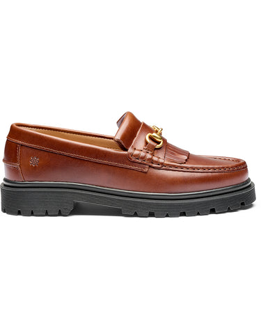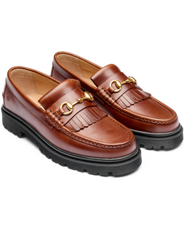 Playboy Milton Brandy er en elegant fringe horsebit loafer i pulled-up læder med en dekorativ frynse på overlæderet. Skoen kombinerer klassisk design med et råt twist takket være den robuste gummisål.