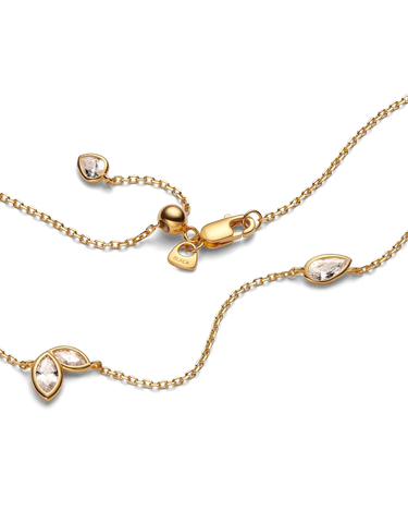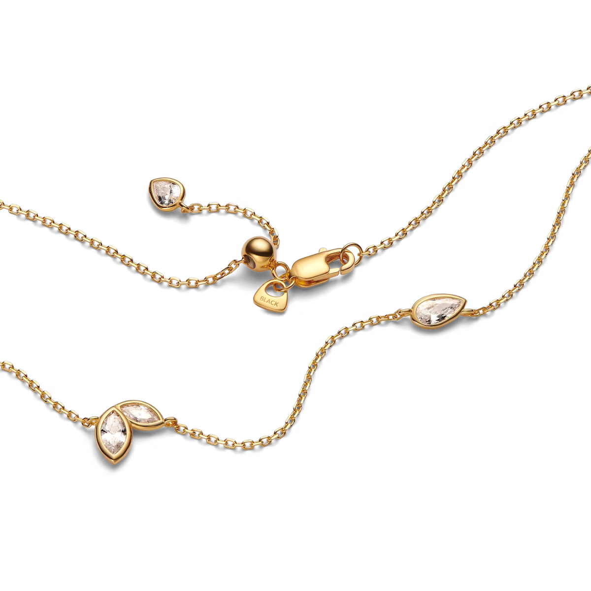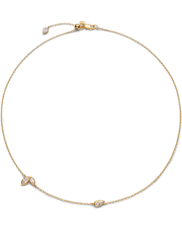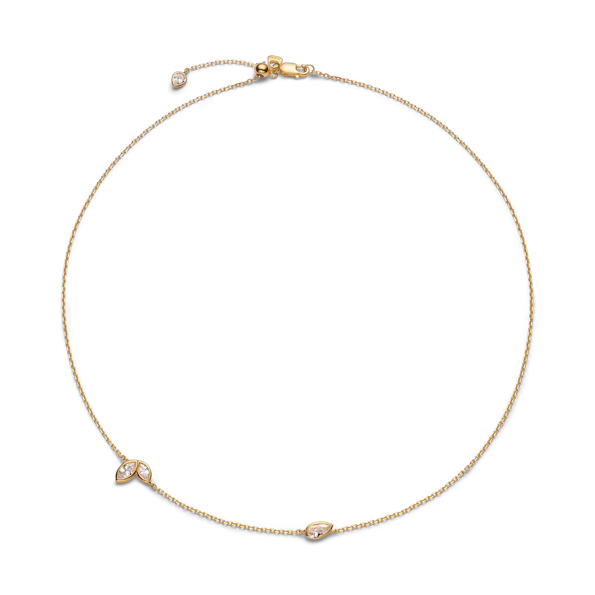 Den fjerlette kæde prydes af unikke forskudte bezel-fatninger med marquise- og pæreslebne hvide zirconia-sten, som reflekterer lyset både for- og bagfra takket være den tynde, gennemsigtige indfatning. Halskæden har en slider-ball, der gør det nemt at justere længden og tilpasse kæden efter dit outfit eller ønskede look.