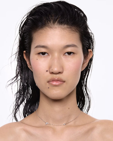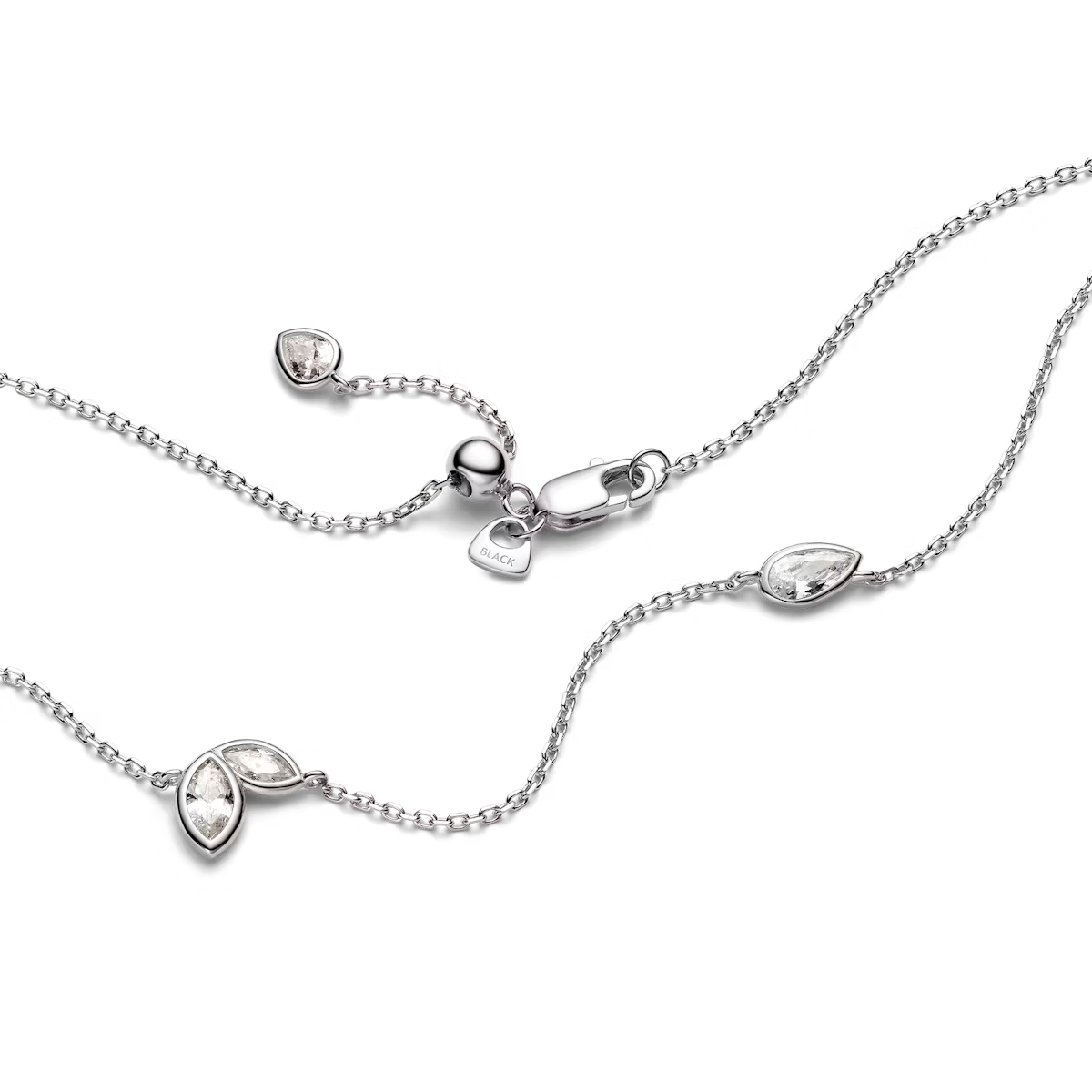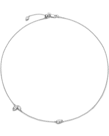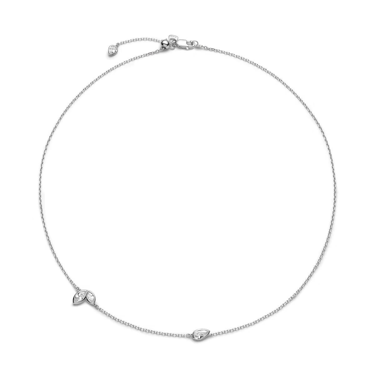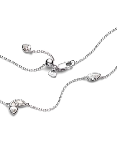 Den fjerlette kæde er udsmykket med unikke forskudte bezel-fatninger, hvor marquise- og pæreslebne hvide zirconia-sten skinner fra både for- og bagside takket være den tynde, gennemsigtige indfatning. Halskæden har en slider-ball, der gør det muligt at justere længden efter dit outfit eller din ønskede stil.