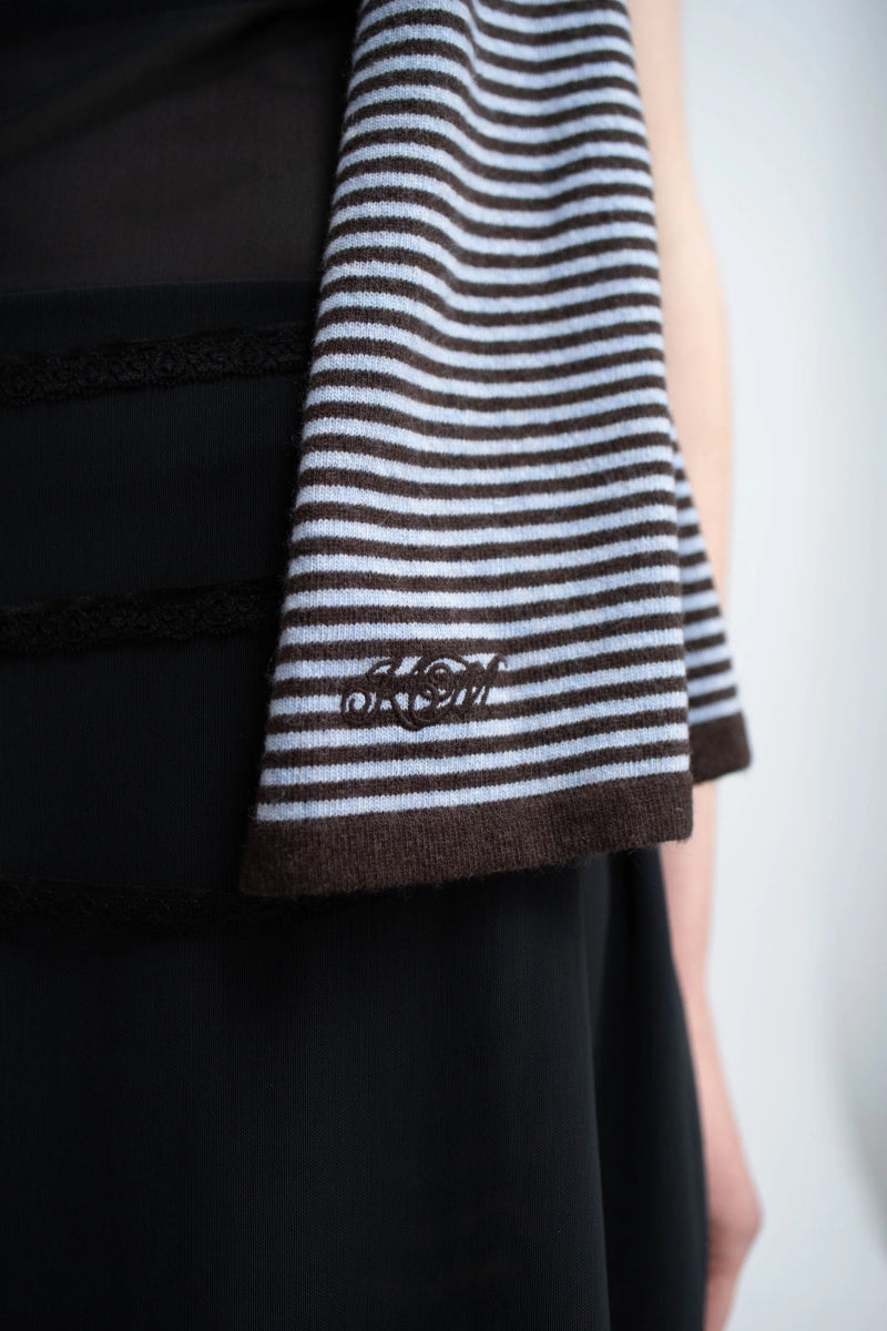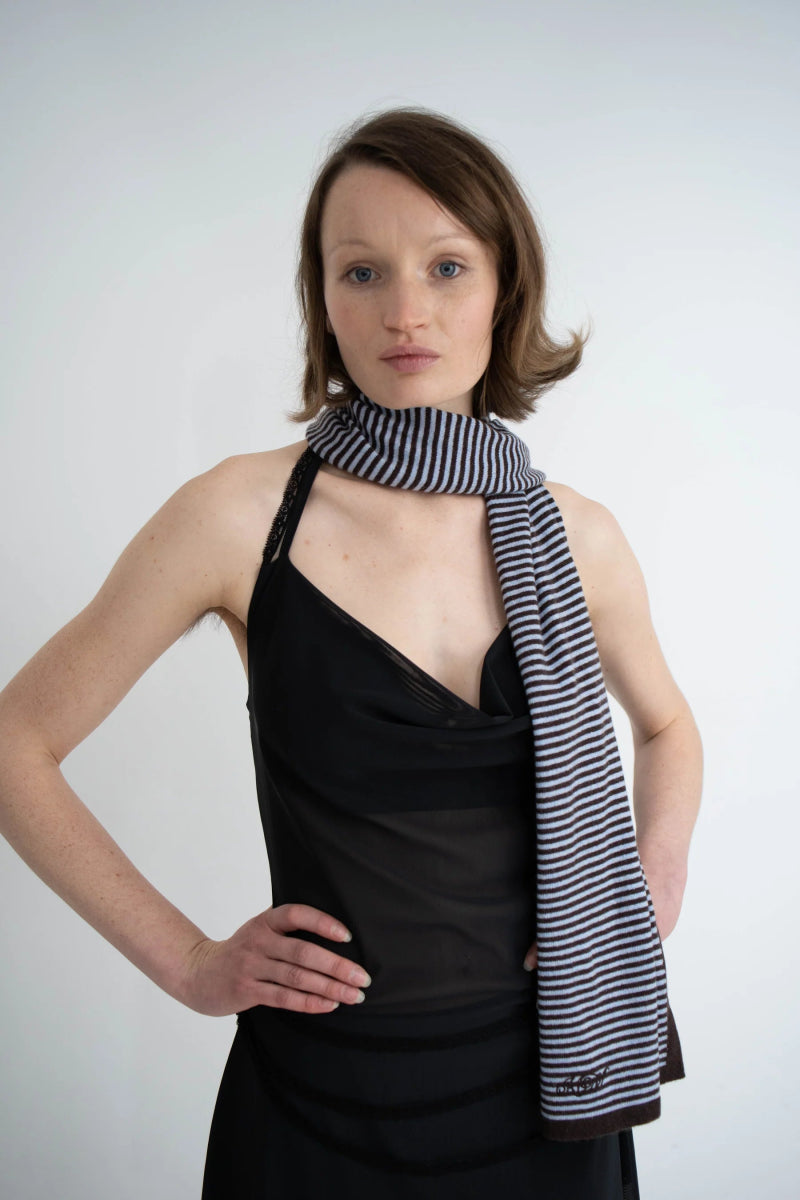 Giv dit outfit et elegant og tidløst touch med Lola Scarf fra KERNEMILK. Dette lyseblå og mørkebrune stribede tørklæde er fremstillet i en luksuriøs uldblanding med 5% cashmere, 25% uld, 40% viscose og 30% polyamid, hvilket giver både varme og blødhed. Den diskrete ‘KM’-brodering tilføjer et sofistikeret detalje, og tørklædet kan styles på mange måder – ideelt til både hverdag og særlige lejligheder.