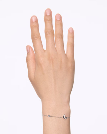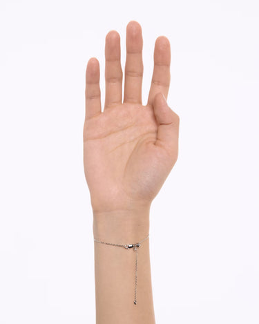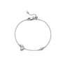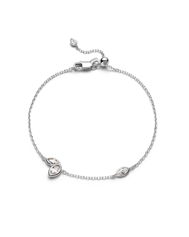 Dette fjerlette kædearmbånd er udsmykket med unikke forskudte bezel-fatninger, hvor marquise- og pæreslebne hvide zirconia-sten skinner fra både for- og bagside takket være den tynde, gennemsigtige indfatning. Armbåndet har en slider-ball, der gør det nemt at justere kædelængden efter dit håndled eller ønskede look.