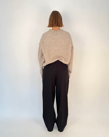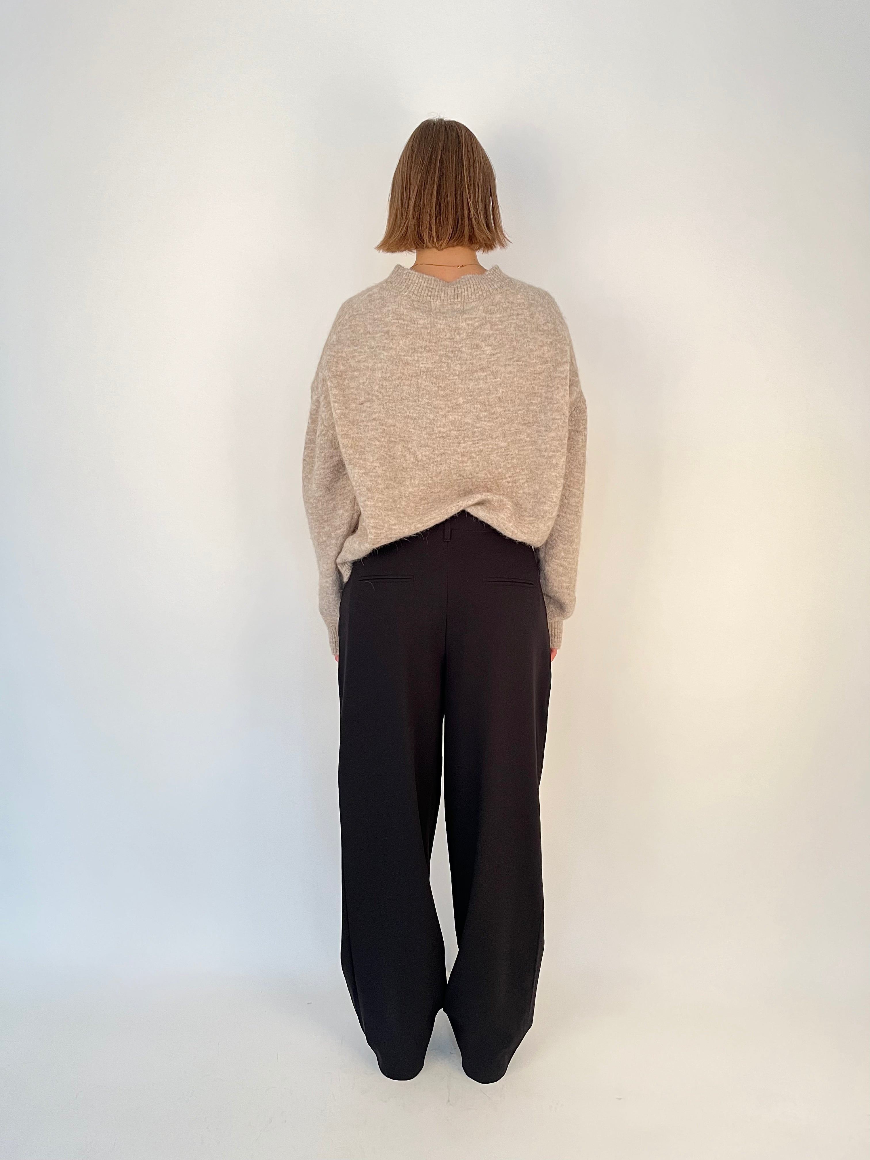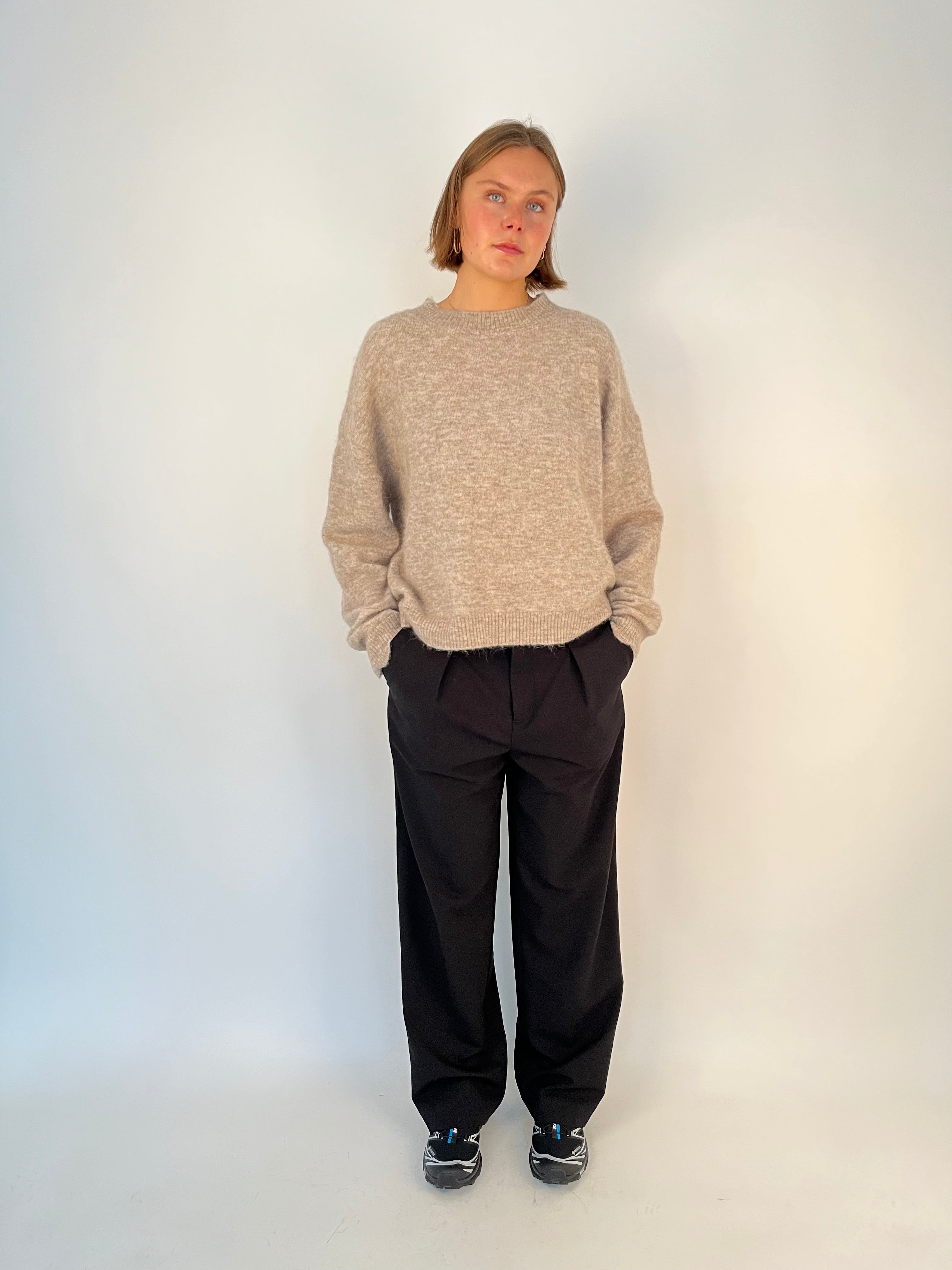 Denne oversize striktrøje i en lys sandfarve tilbyder en kombination af luksus og komfort. Fremstillet af en eksklusiv blanding af alpaka og merinould for maksimal varme og blødhed, mens polyamid og elastan tilføjer holdbarhed og stræk. Perfekt til både afslappede og sofistikerede looks.