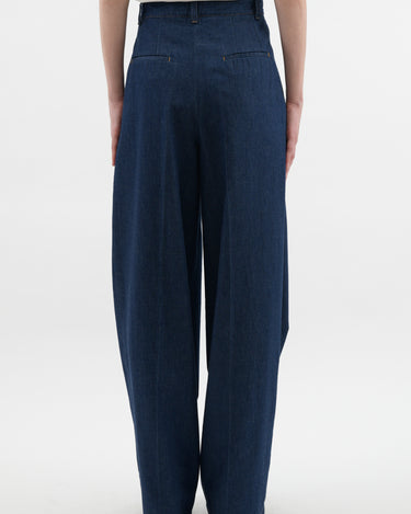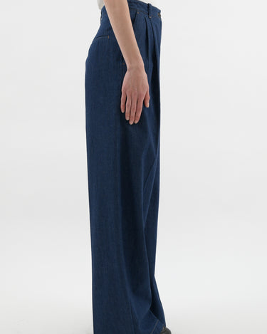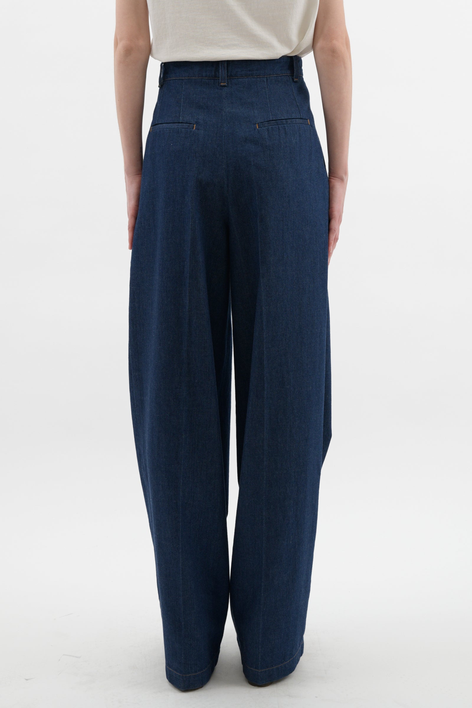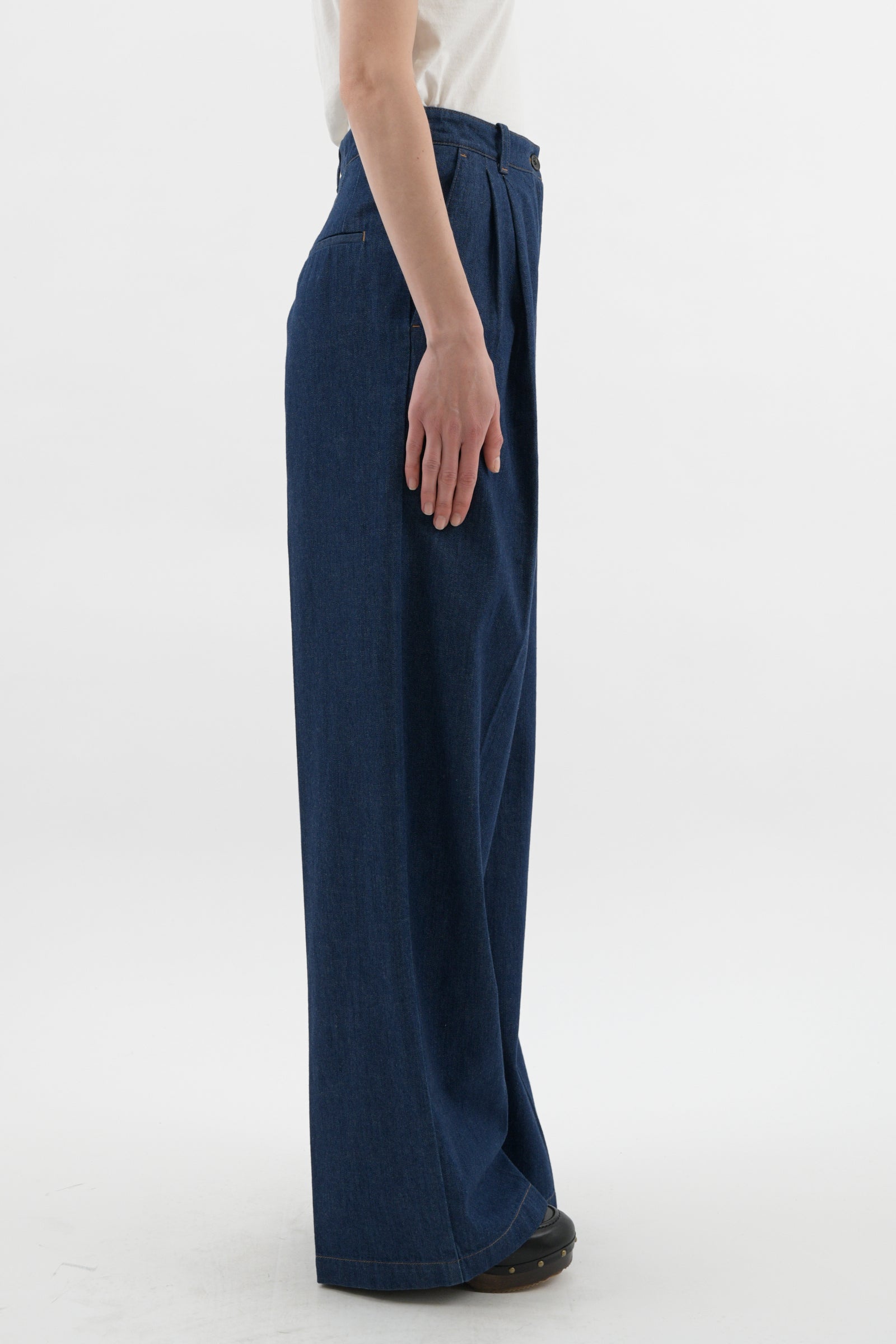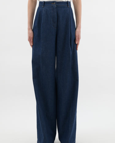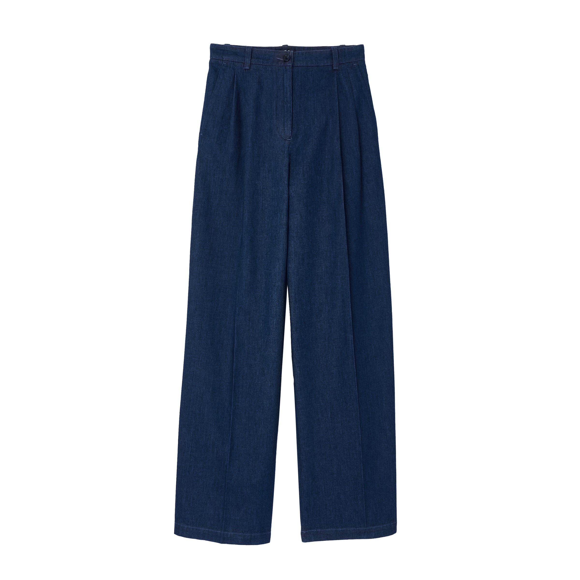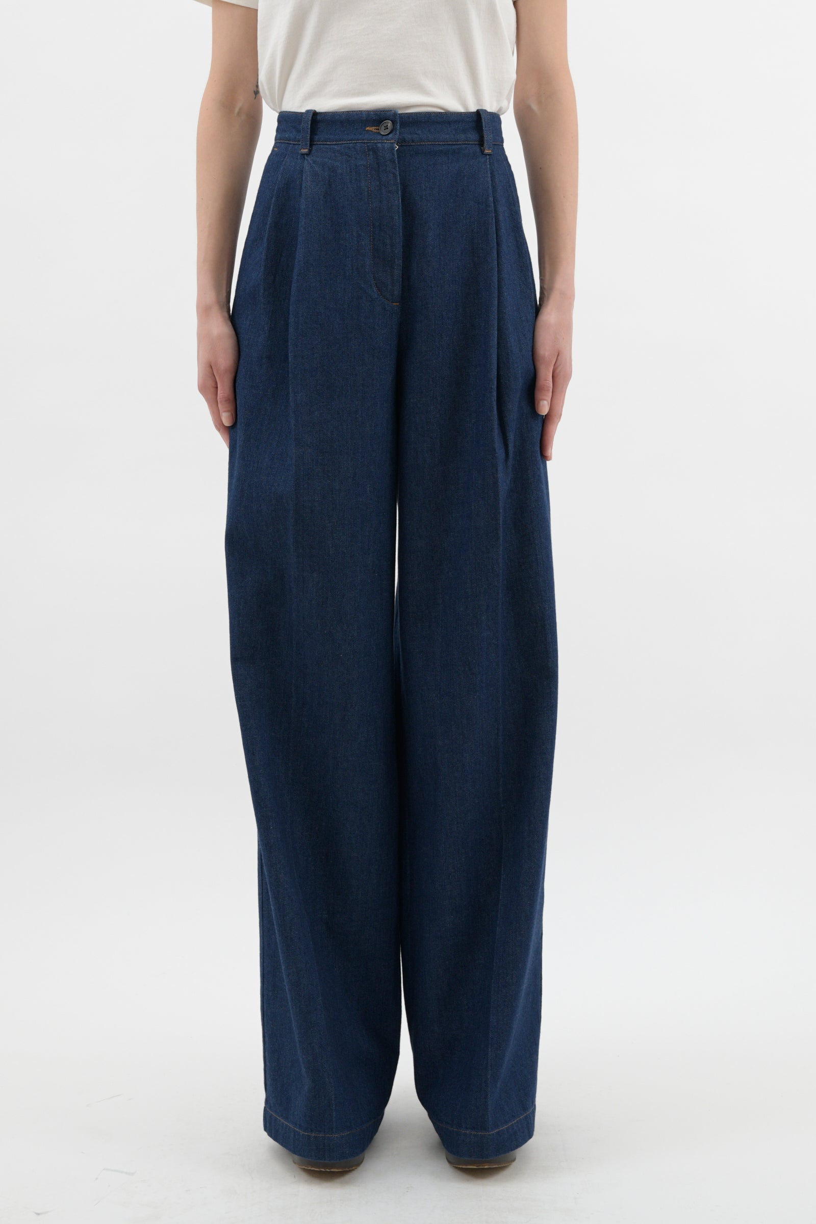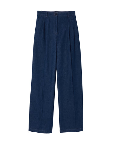 A.P.C.’s Ginny Trousers i indigo er et par elegante, bredbenede bukser fremstillet i 100% økologisk bomuld. Denimkvaliteten er let og struktureret, hvilket giver bukserne et raffineret fald og en afslappet, men sofistikeret silhuet. De frontlagte læg tilføjer volumen og form, mens den høje, rene talje gør dem nemme at style med både skjorter, strik og simple T-shirts.