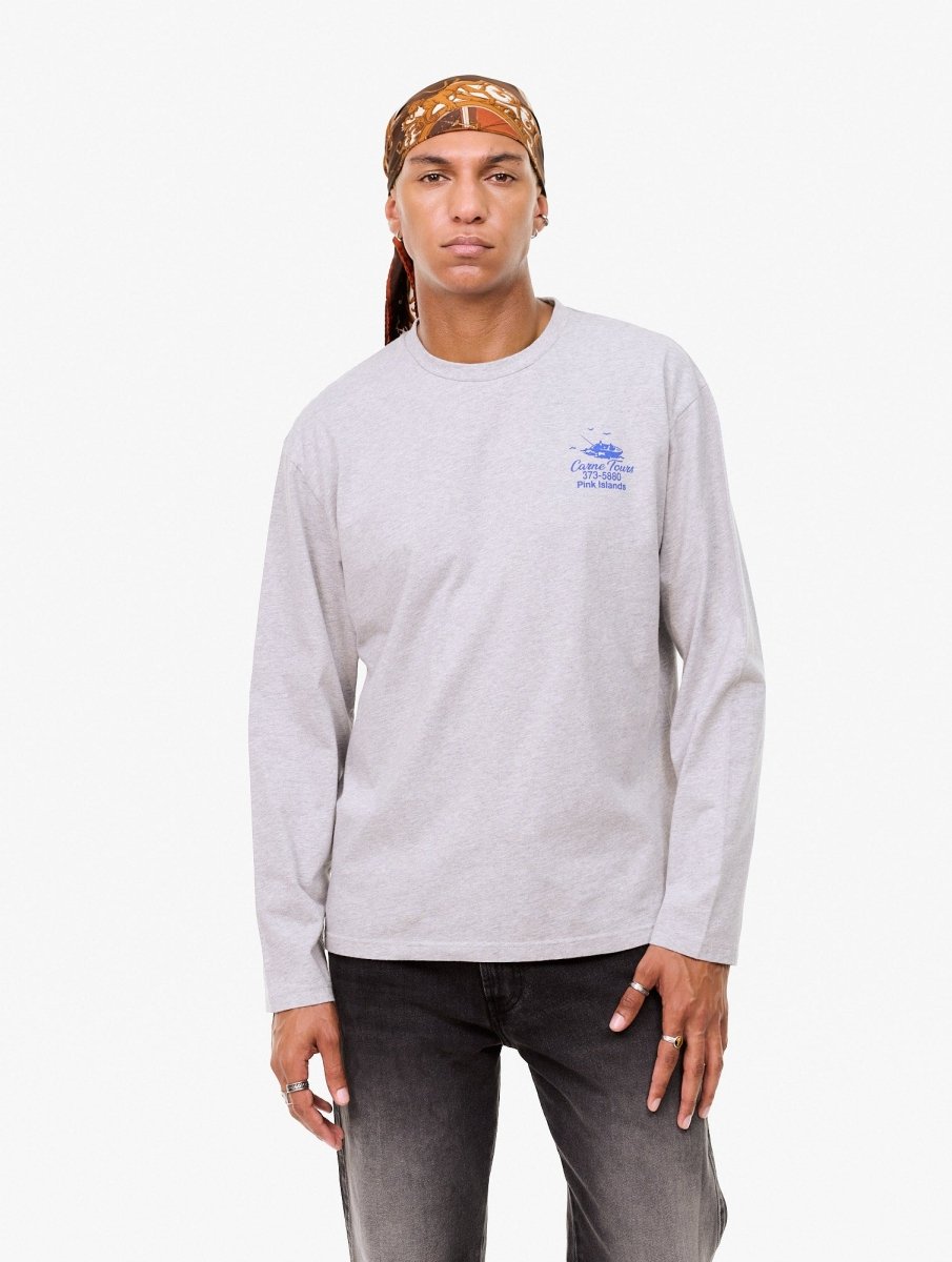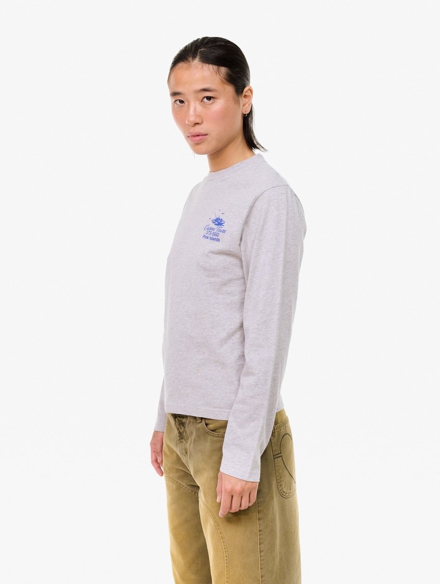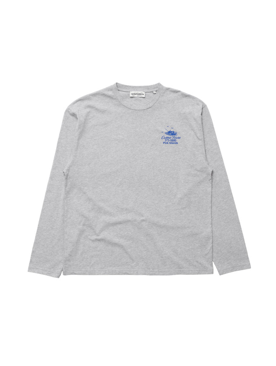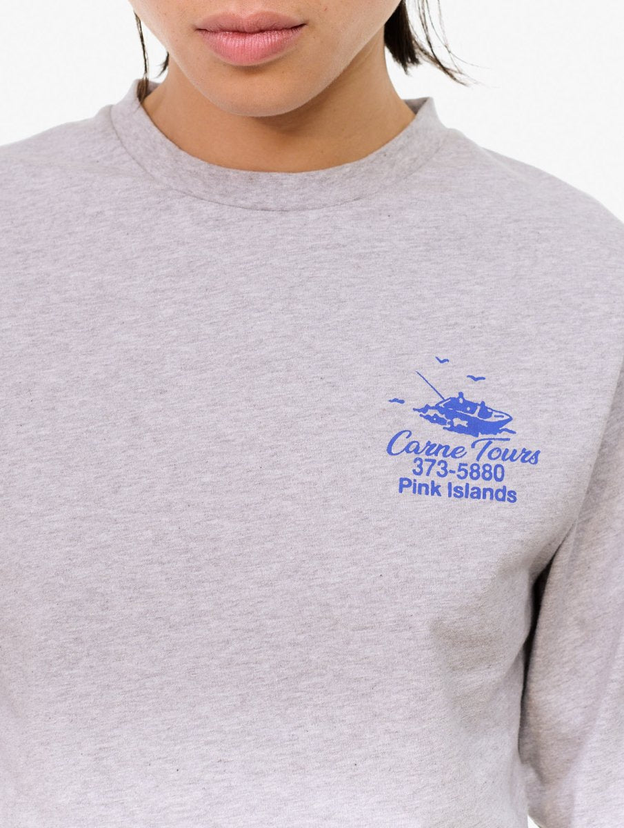 Carne World Tour er en boxy-fit long sleeve T-shirt i 100% økologisk bomuld med grafiske prints på både front og ryg. Den melerede grå base giver et afslappet og alsidigt udtryk, mens de farverige detaljer tilfører den karakteristiske Carne-energi.