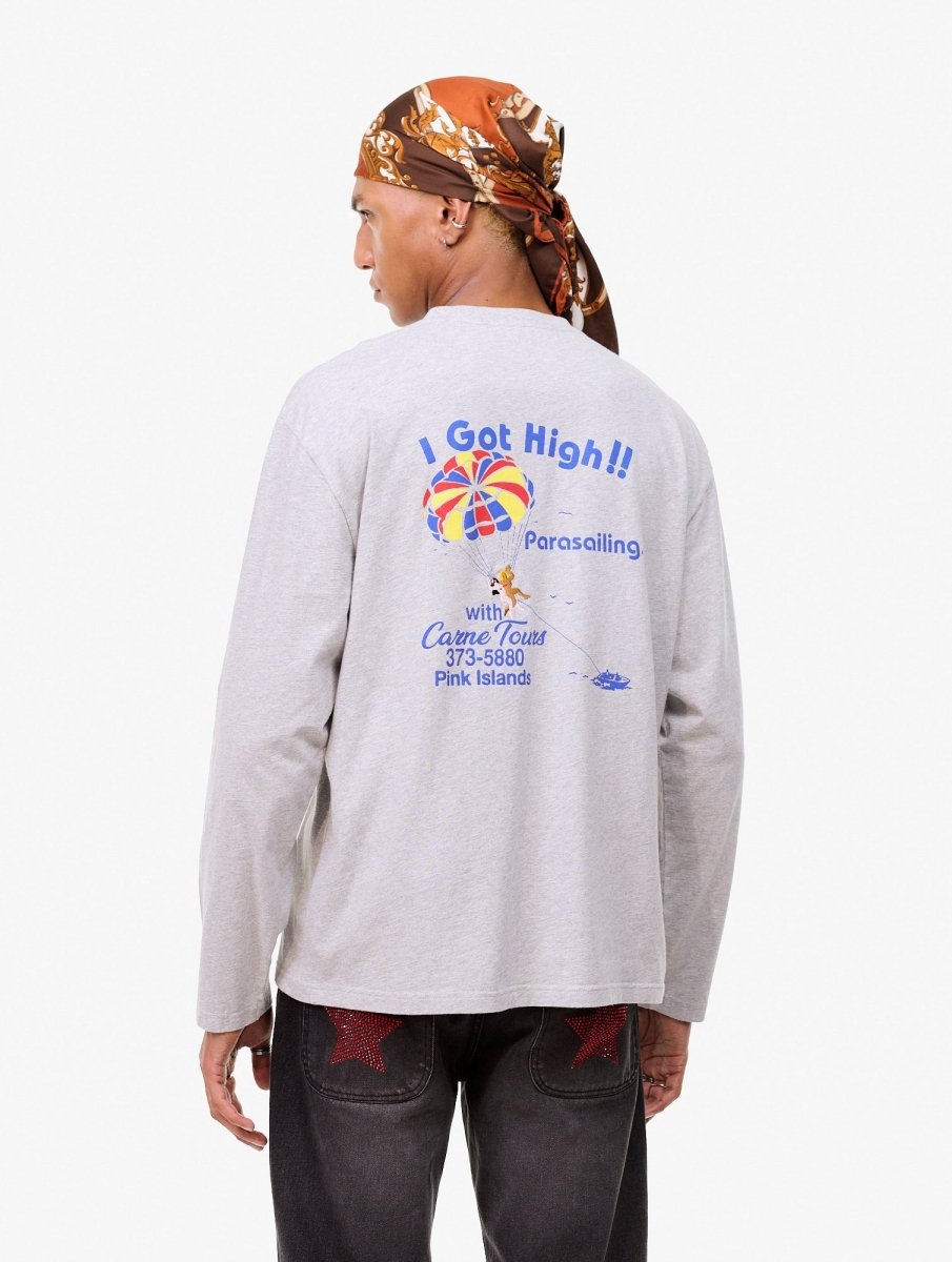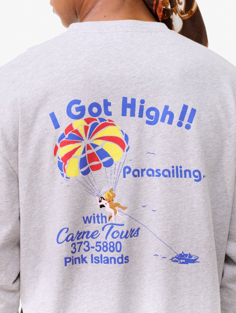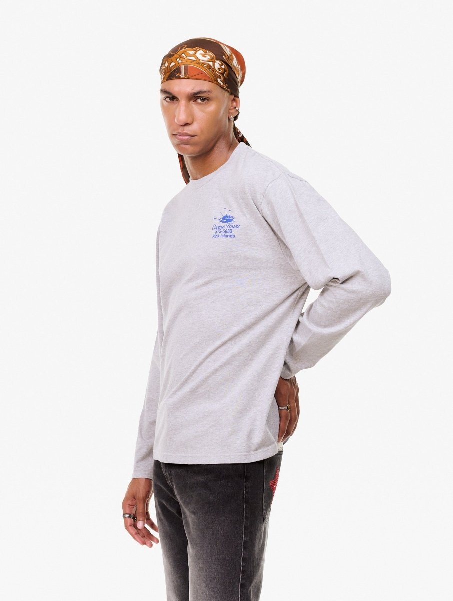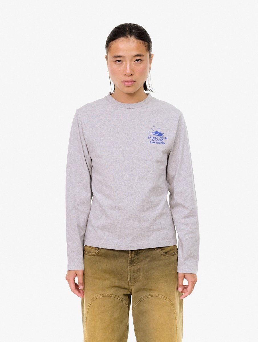 Carne World Tour er en boxy-fit long sleeve T-shirt i 100% økologisk bomuld med grafiske prints på både front og ryg. Den melerede grå base giver et afslappet og alsidigt udtryk, mens de farverige detaljer tilfører den karakteristiske Carne-energi.