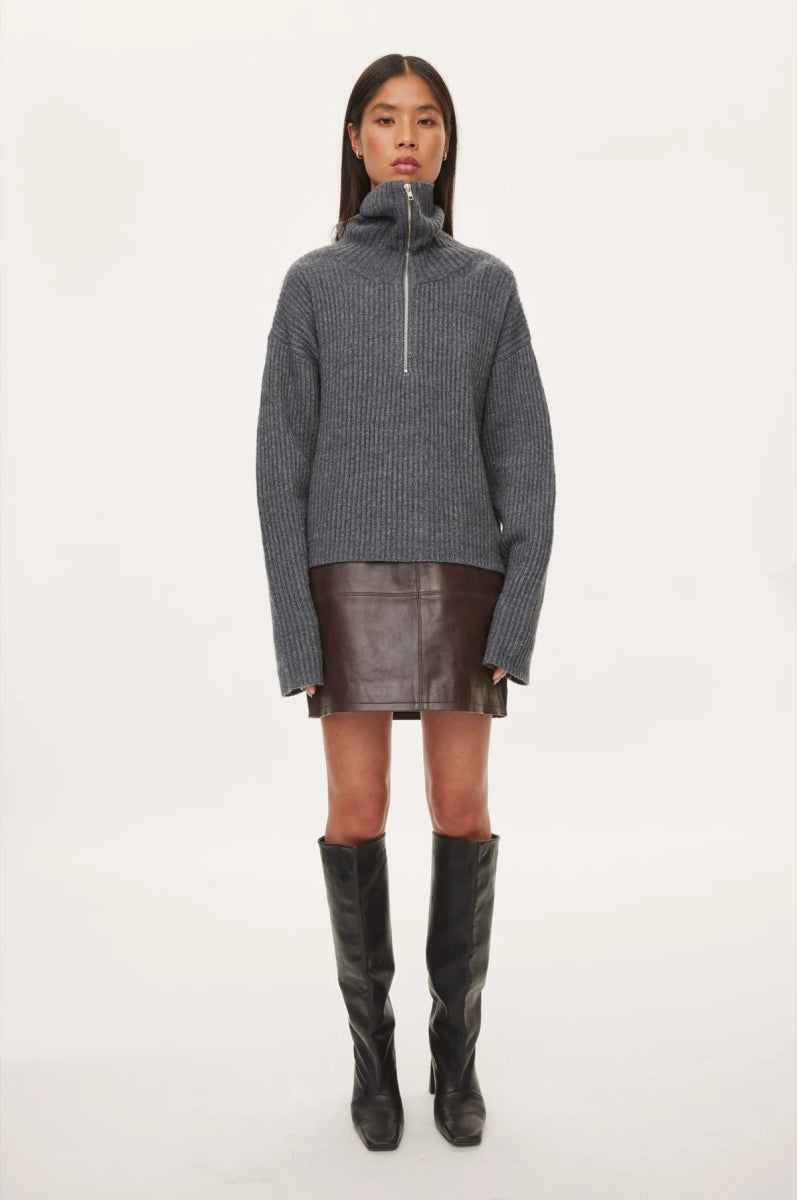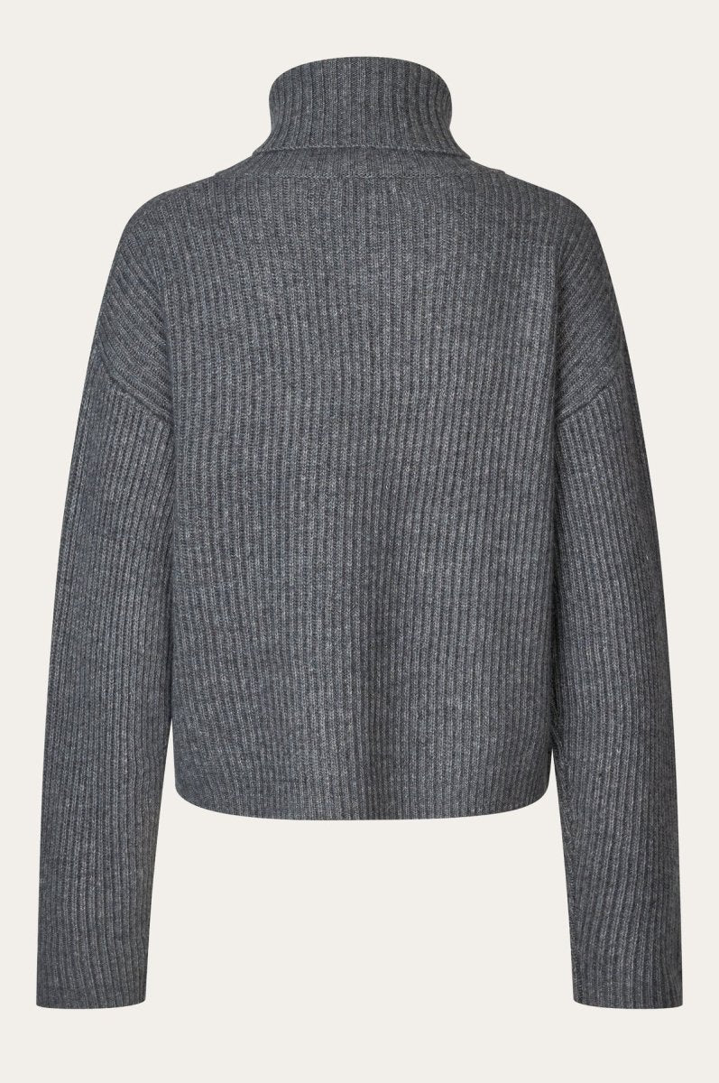 Oval Square Fave Zip Knit i Dark Grey Melange er en moderne og komfortabel striktrøje, fremstillet i en blød og elastisk uldblanding (80% uld, 20% nylon). Den ribstrikkede trøje har en bred turtleneck med halv lynlås, der kan foldes, samt droppede skuldre og lange, brede ærmer, hvilket giver en afslappet og tidløs silhuet.