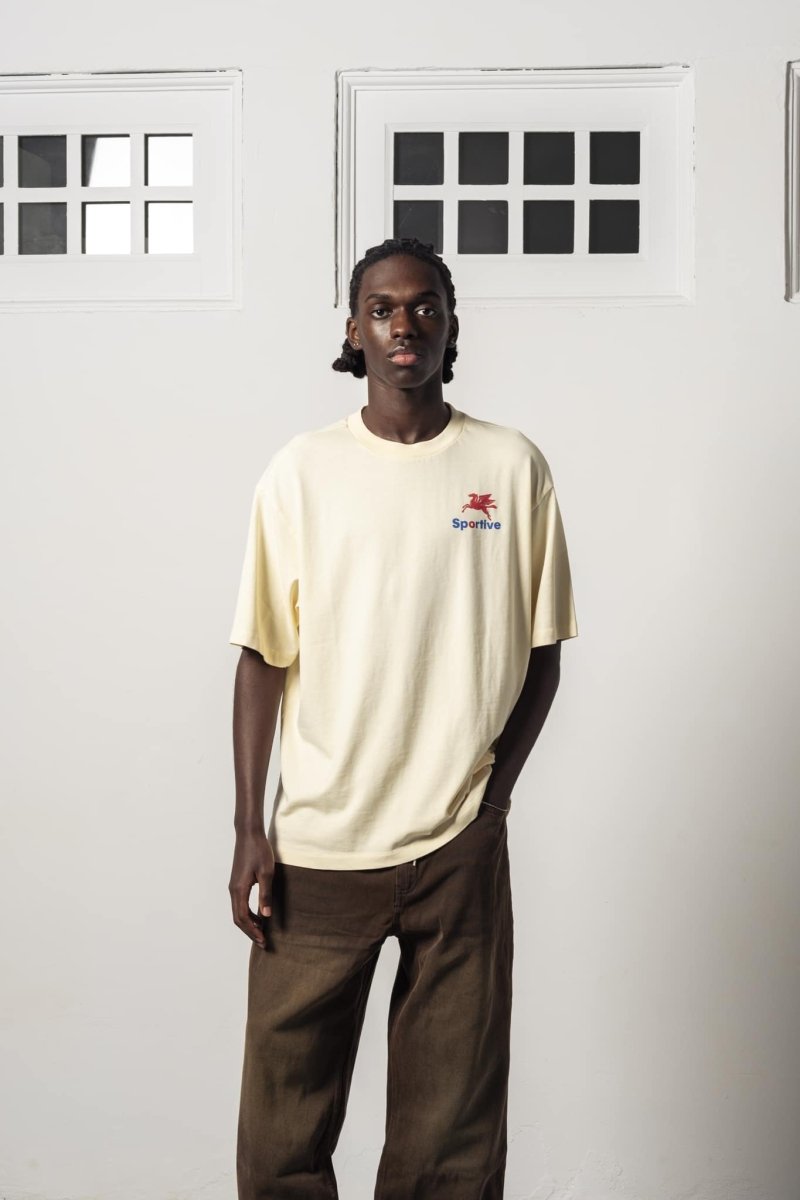 Goodies Sportive Pegasus Butter T-shirt er fremstillet i 290 g/m² økologisk bomuld, som giver en blød, tung og luksuriøs kvalitet. T-shirten har en afslappet pasform med korte ærmer og rund hals, hvilket gør den velegnet til både hverdagsbrug og afslappede outfits.