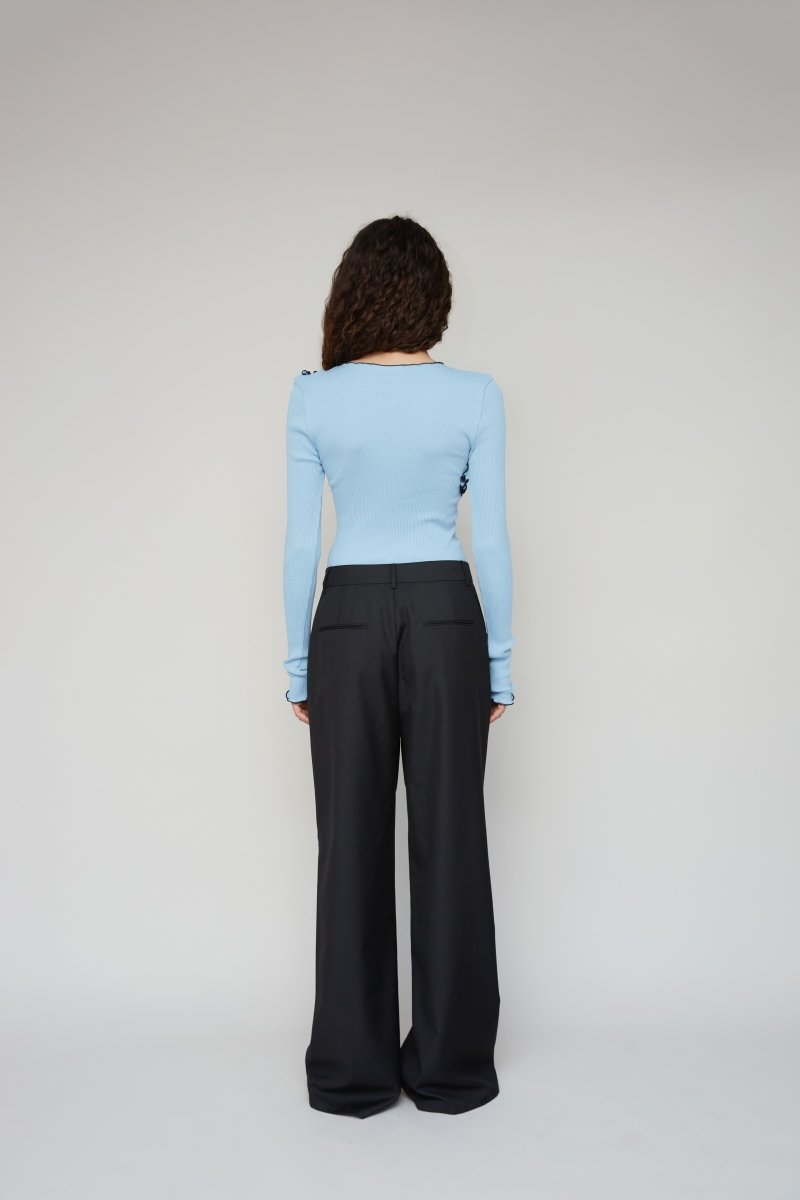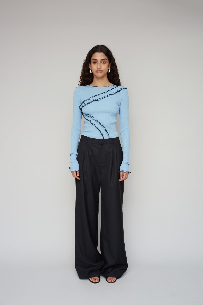 Gisèle Seamless Top er fremstillet af 100% økologisk bomuld i blå. Den er designet til en tætsiddende pasform og har lange ærmer og bølgede flæsedetaljer, der kurver hen over kroppen og ærmerne og tilføjer tekstur og karakter til silhuetten.
