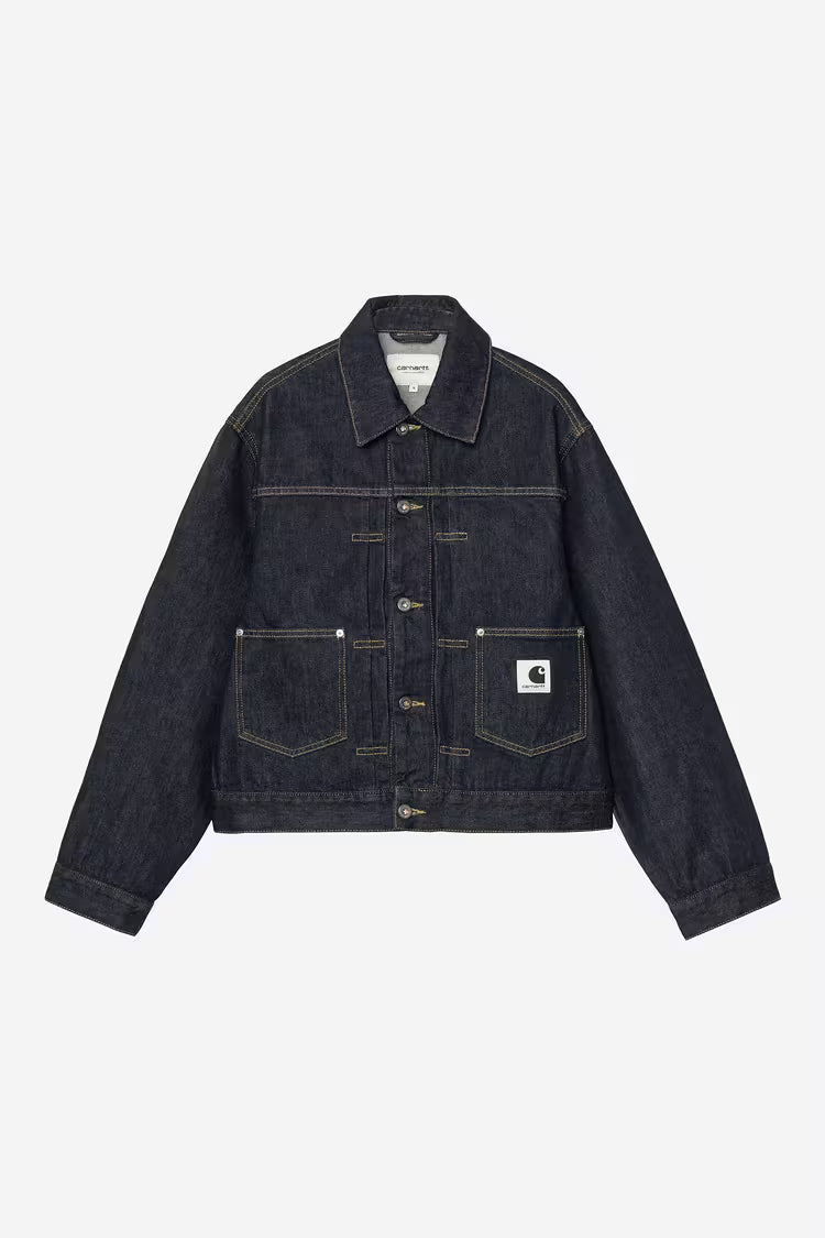 Belmar-jakken til kvinder er lavet af kraftig, uforet bomuldsdenim. Jakken har to brystlommer og to sidelommer og er detaljeret med trensesyning og metalnitter på vigtige belastningspunkter. Et vævet firkantet mærke fuldender designet.
