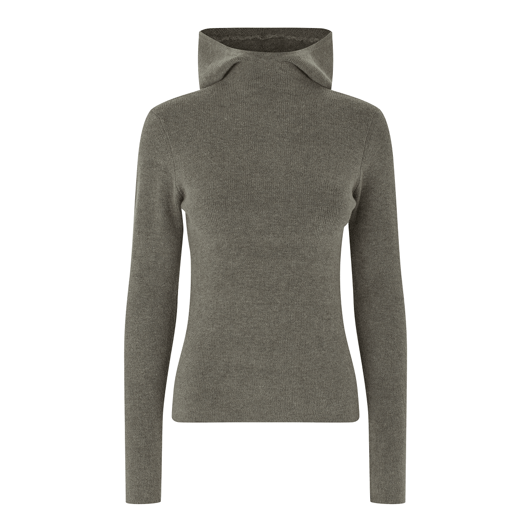 - Detaljer: Ribstrikket struktur, integreret hætte, lange ærmer