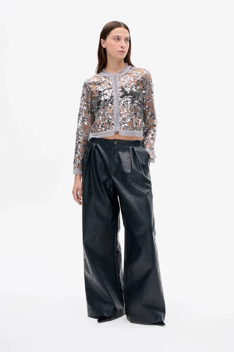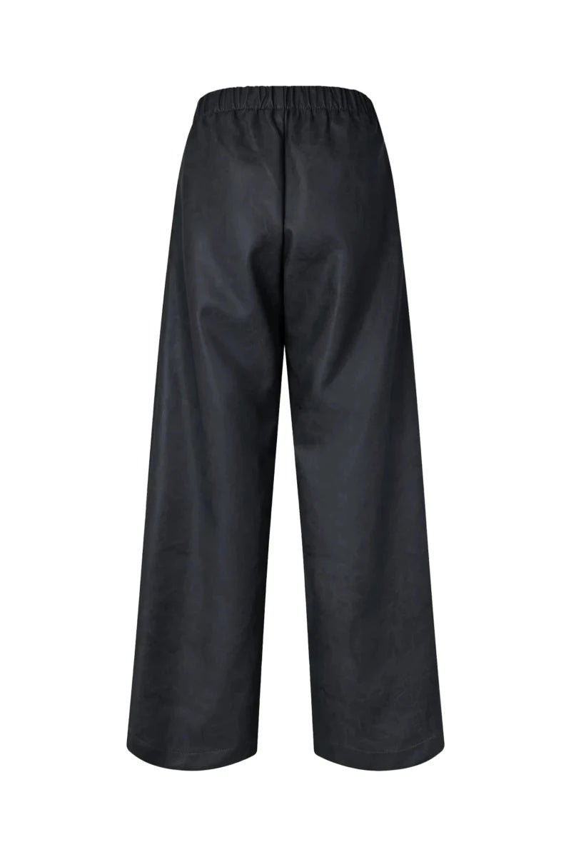 Naomie-bukserne er lavet i krakeleret kunstlæder. Bukserne er designet med en høj talje og løs pasform, har vide ben og plisserede detaljer i taljen. En behagelig elastisk linning bagpå sikrer en nem pasform, med sidelommer og en lynlåslukning foran for praktisk anvendelighed.