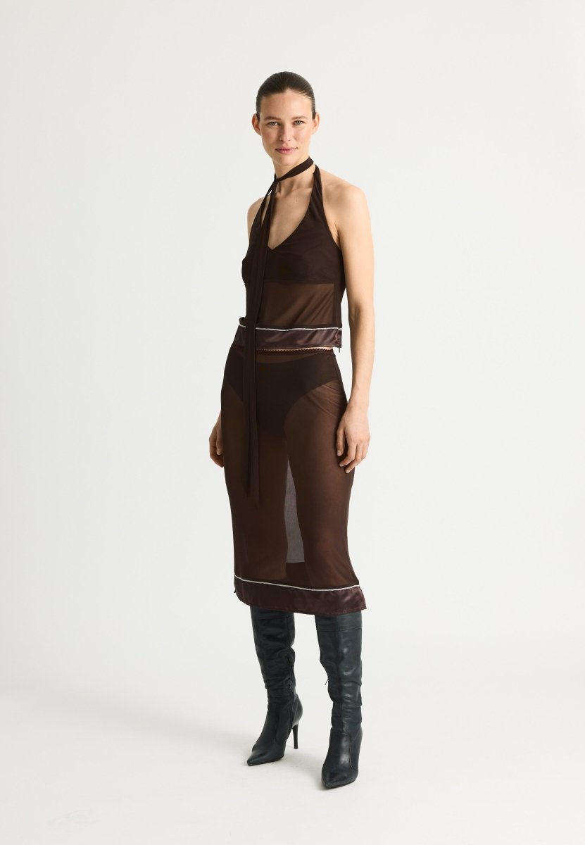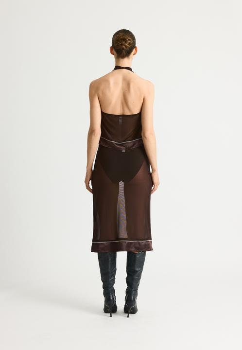 KendraRS Top fra Résumé er en elegant og tætsiddende mesh-top i en dyb mørkebrun farve. Den semi-transparente kvalitet og det lette stræk giver et moderne, sofistikeret udtryk, der gør toppen perfekt til både layering og aftenlooks. Brug den under en blazer, med højtaljede bukser eller sammen med nederdele for et stilrent og feminint outfit.