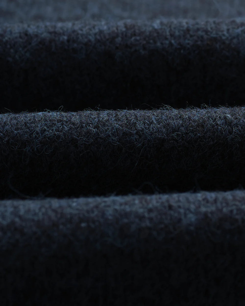 Den bløde, børstede overflade fremhæver den dybe teal-farve, mens ribkanter ved hals, manchetter og søm tilføjer et klassisk og tidløst udtryk.