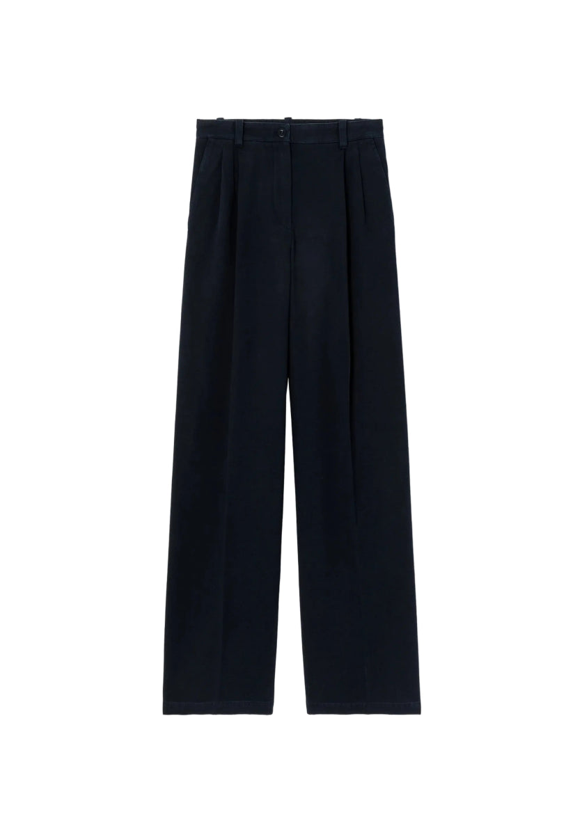 De markante pressefolder foran og bagpå tilfører et skarpt, velklædt udtryk, mens tone-i-tone knapper i faux horn understreger det minimalistiske design. Bukserne er udstyret med to sidelommer og to baglommer og er fremstillet i økologisk bomuld af høj kvalitet.