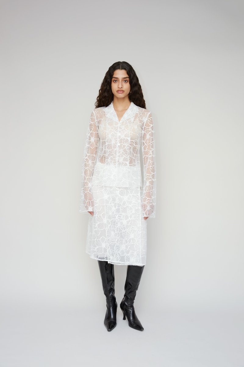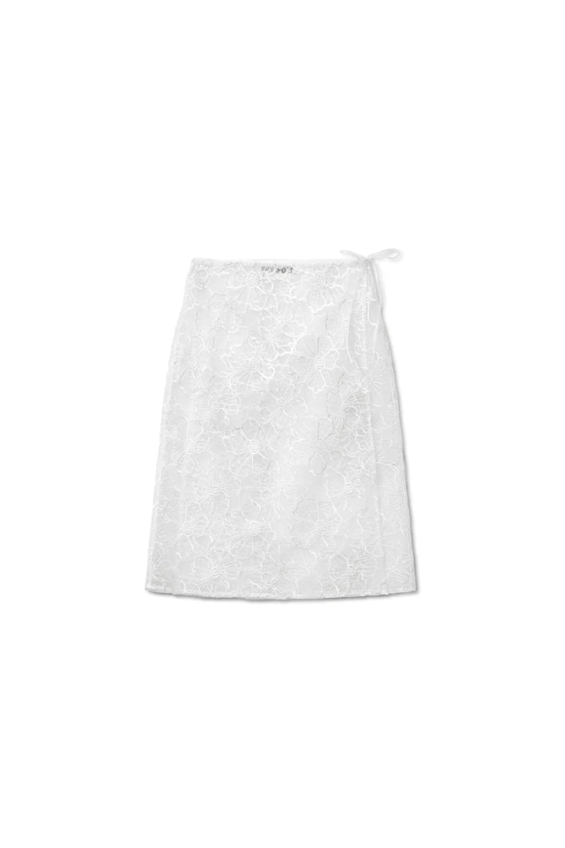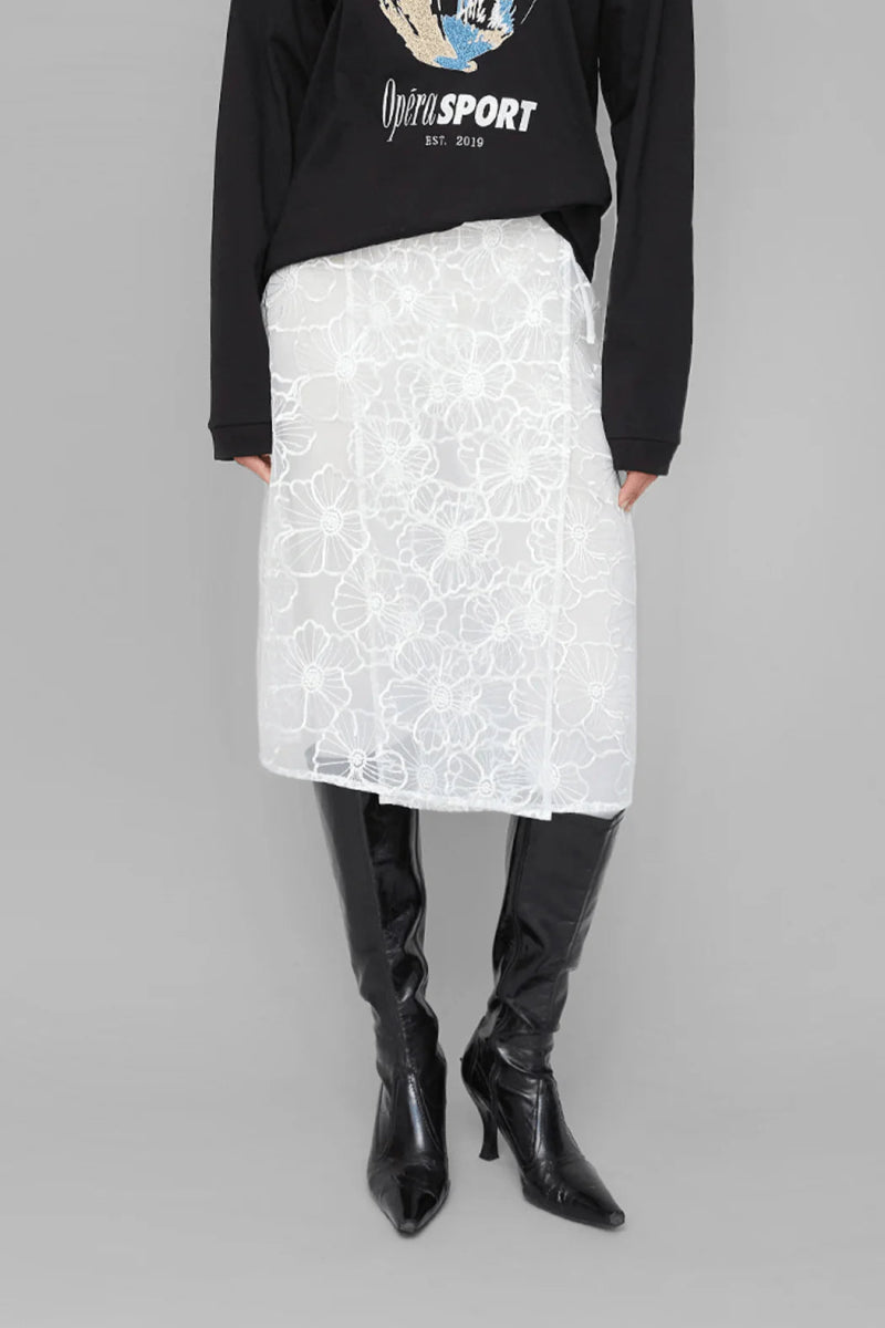 Den fantastiske blonde Alba Long Skirt i hvid er fremstillet af 90% genbrugt polyamid og 10% genbrugt polyester. Den har et wraparound-design og aflange bånd for en feminin sløjfe. Nederdelen kan bæres over strømpebukser eller bukser, samt med mindre underdel for et mere dristigt look.