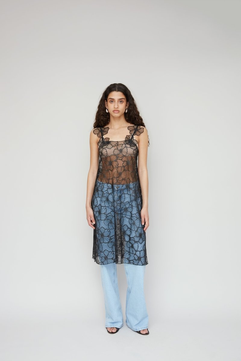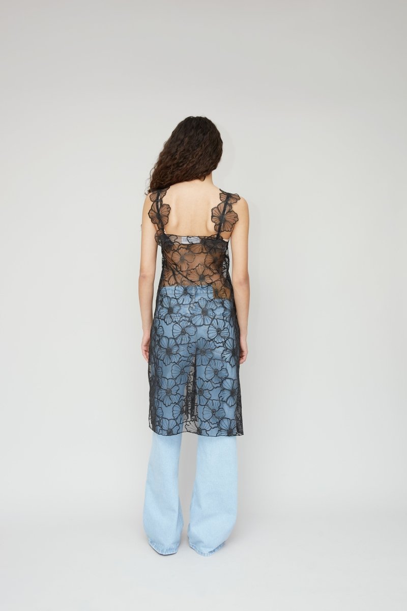 Iris-kjolen er fremstillet af 90% genbrugt polyamid og 10% genbrugt polyester. Den er designet i sort, gennemsigtigt, blomstret blonde, har fine stropper, en løs pasform og en længde til under knæet. Den er let og alsidig og kan styles alene eller som lag over bukser og nederdele for et dristigt, moderne look.