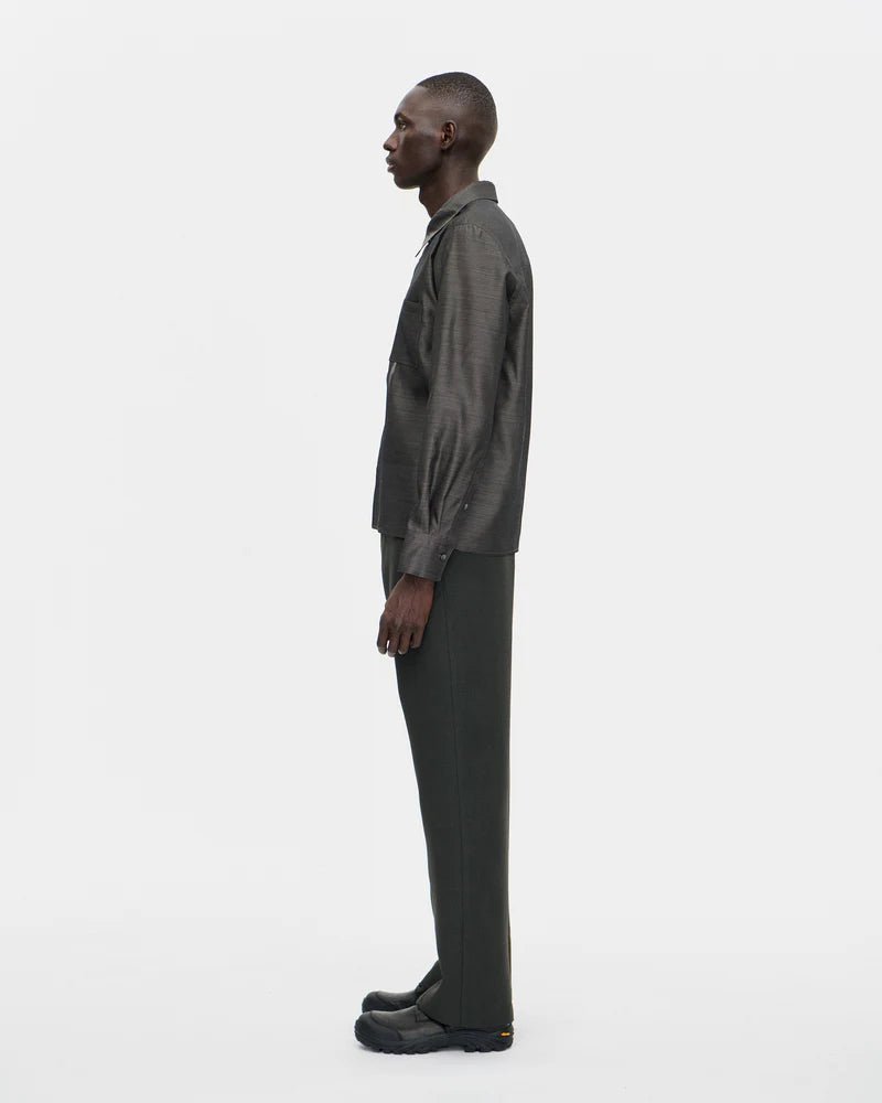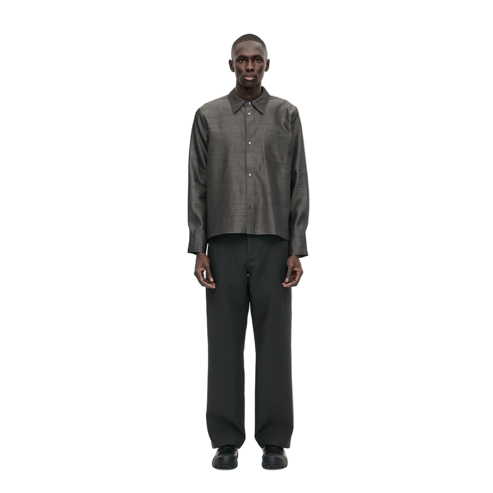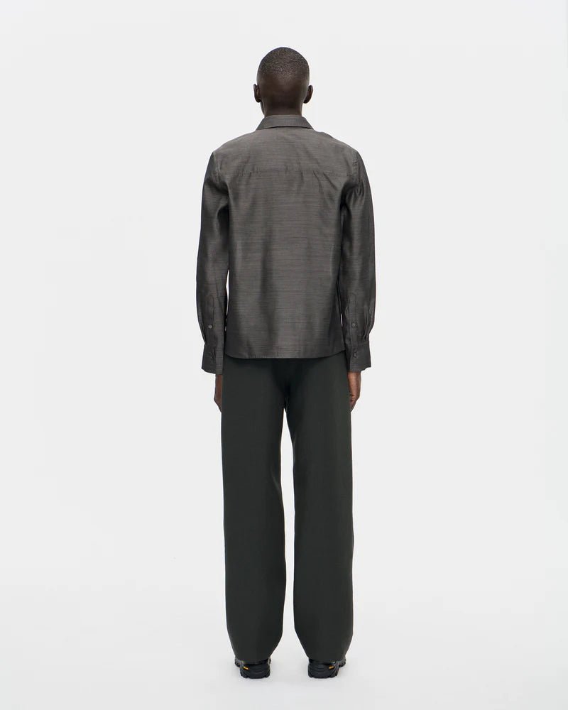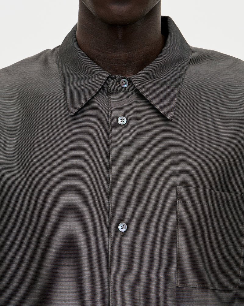 Skjorten har en let figursyet pasform med diskret buet søm, som skaber en sofistikeret silhuet. De mørkegrå ægte perlemorsknapper tilføjer et eksklusivt touch, mens den åbne vævning giver åndbarhed og komfort. Et elegant valg til både formelle lejligheder og stilbevidste hverdagslooks.