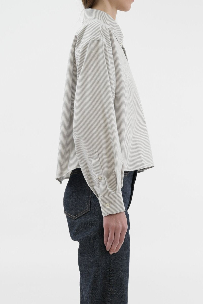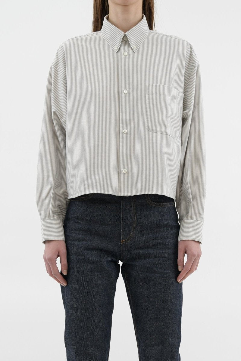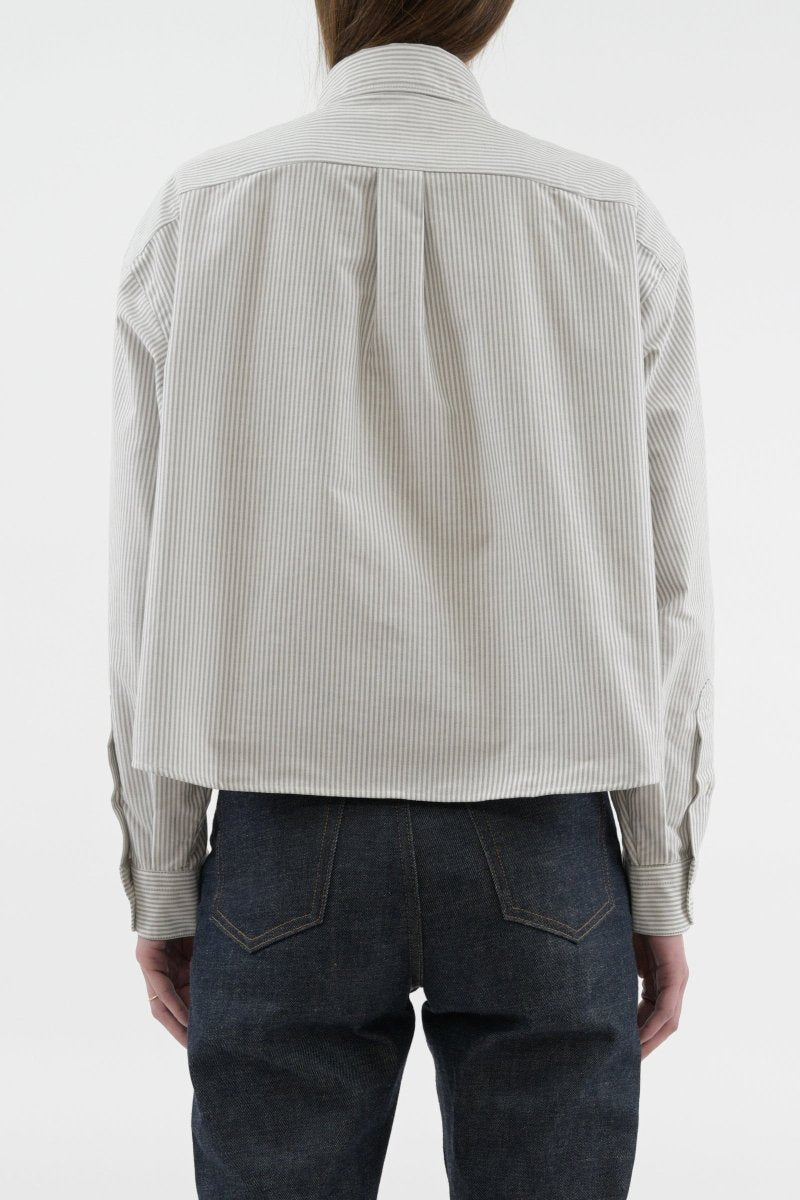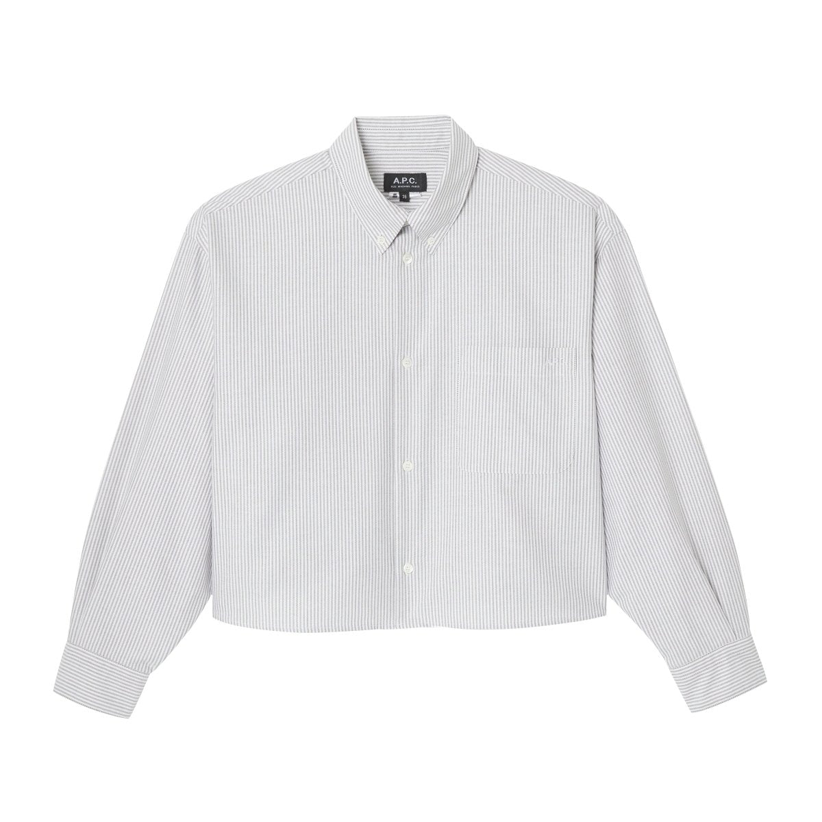 Kortærmet skjorte med lige pasform og button-down krave. Designet med skrånende skuldre og slidser i siderne for en afslappet silhuet. Skjorten har en enkelt brystlomme med diskret tone-i-tone A.P.C.-logo broderet. Afsluttet med hvide perlemorsknapper.