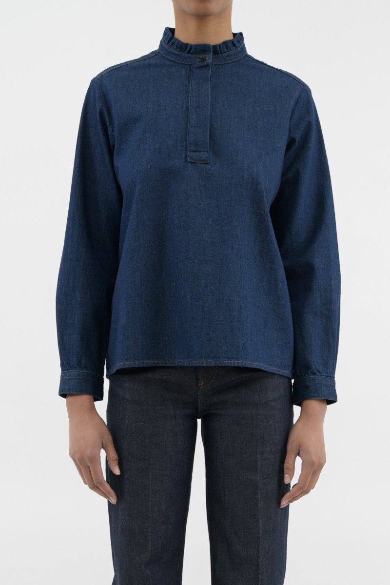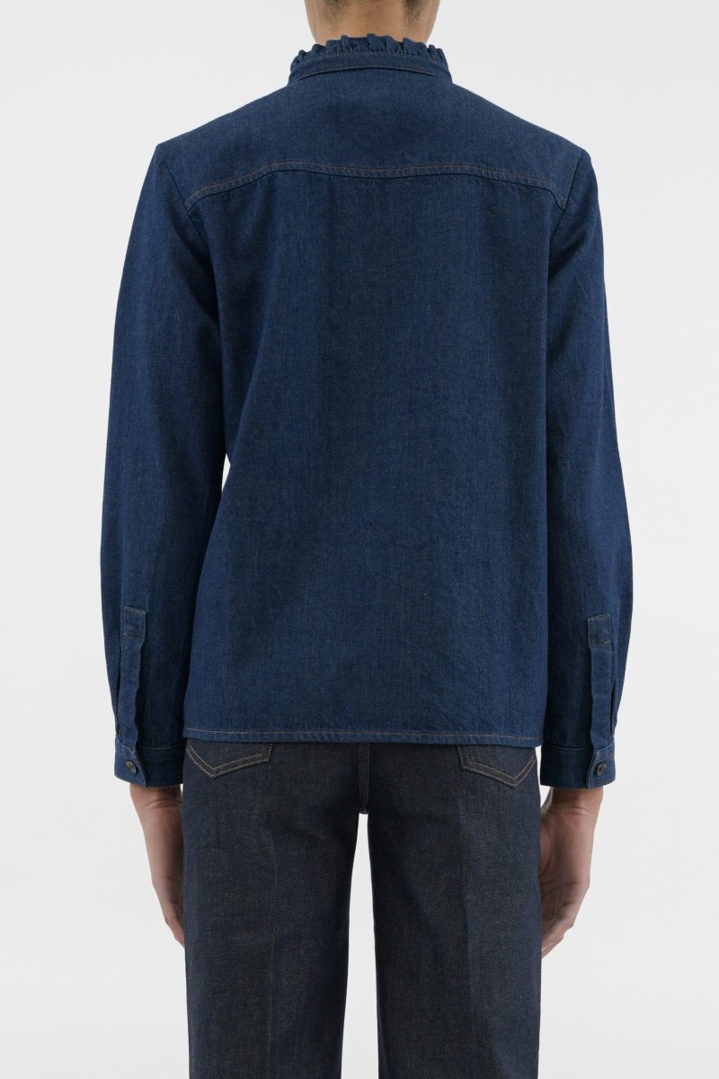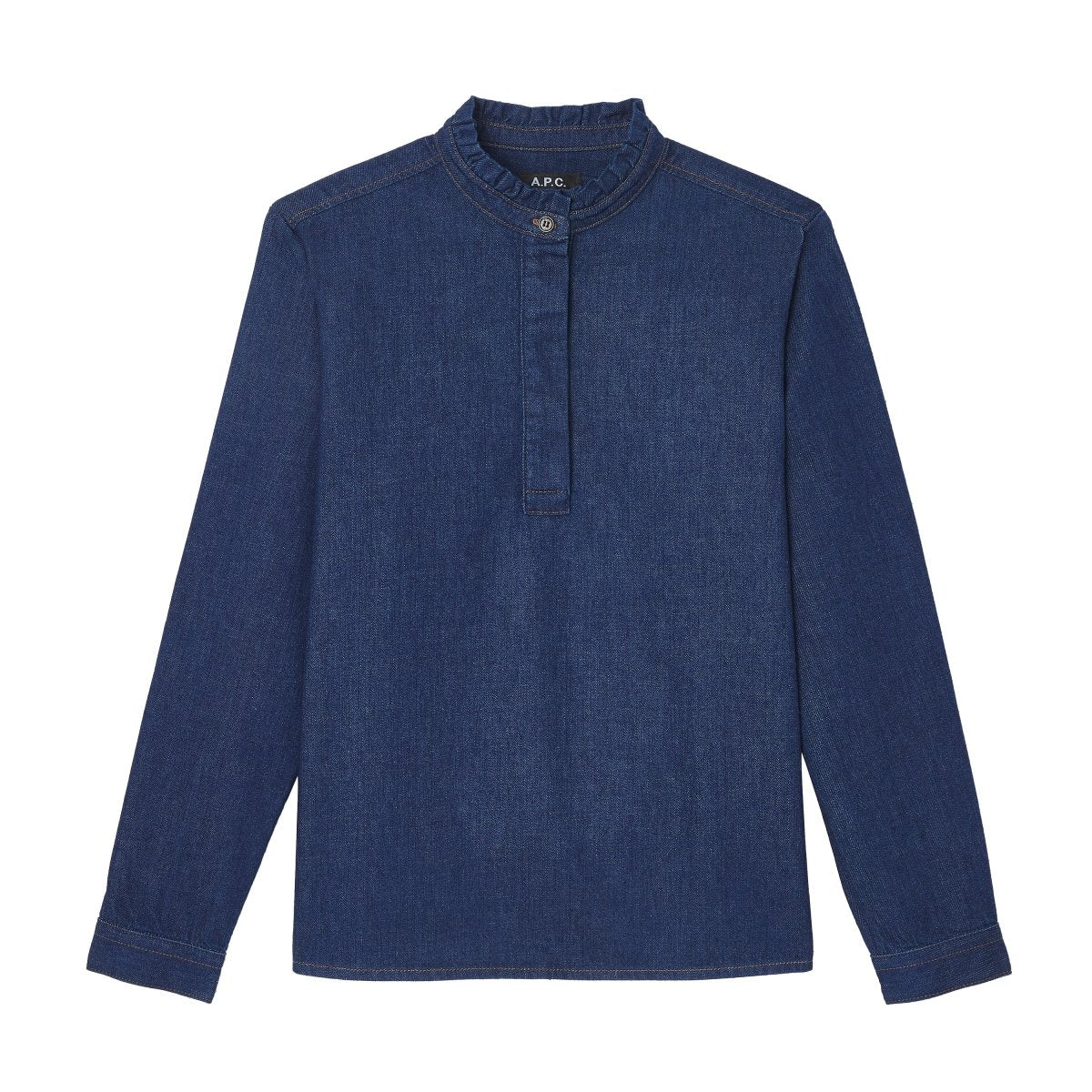A.P.C.’s denim blouse i indigo er en minimalistisk og tidløs style fremstillet i 100% økologisk bomuld. Den rene denimkvalitet giver et struktureret, men blødt udtryk, der gør skjorten velegnet til både afslappede og mere formelle looks. Den stående krave med let rynket kant og en halv knaplukning foran tilfører et raffineret, underspillet design-element, som er karakteristisk for A.P.C.’s enkle æstetik.