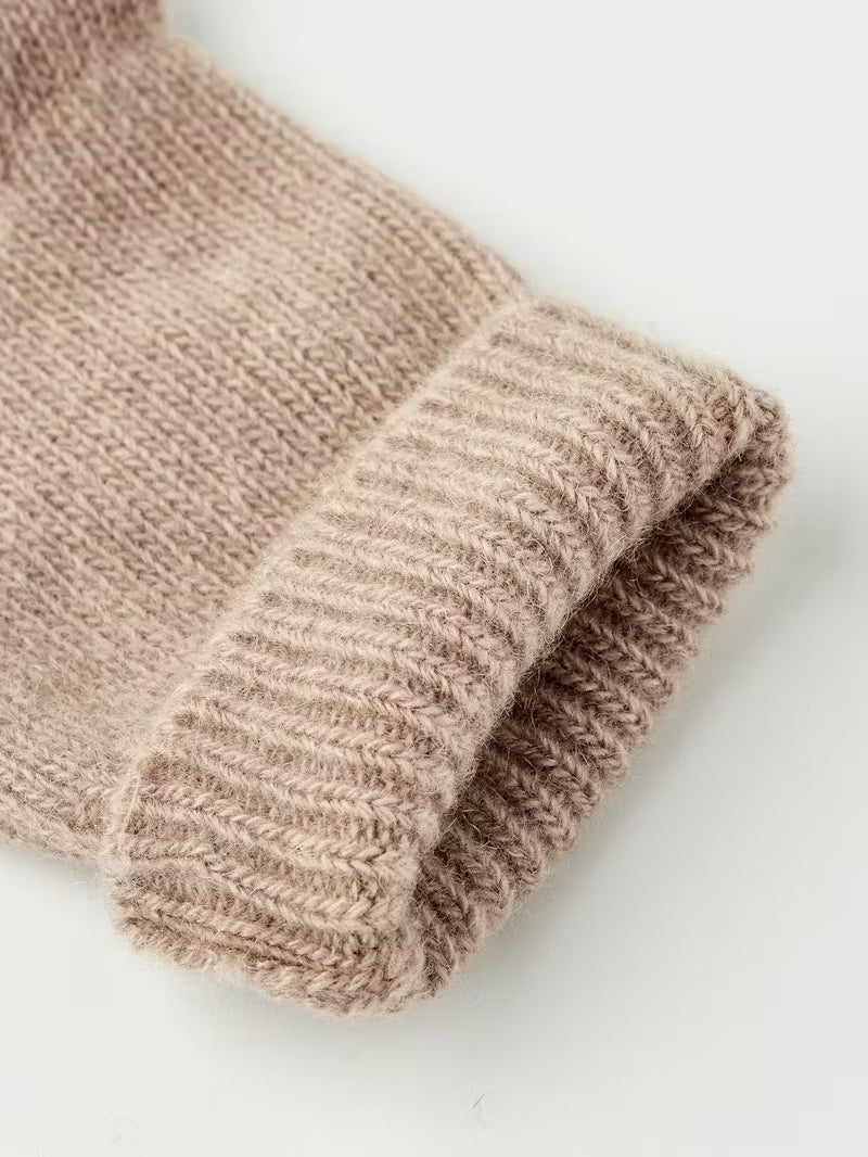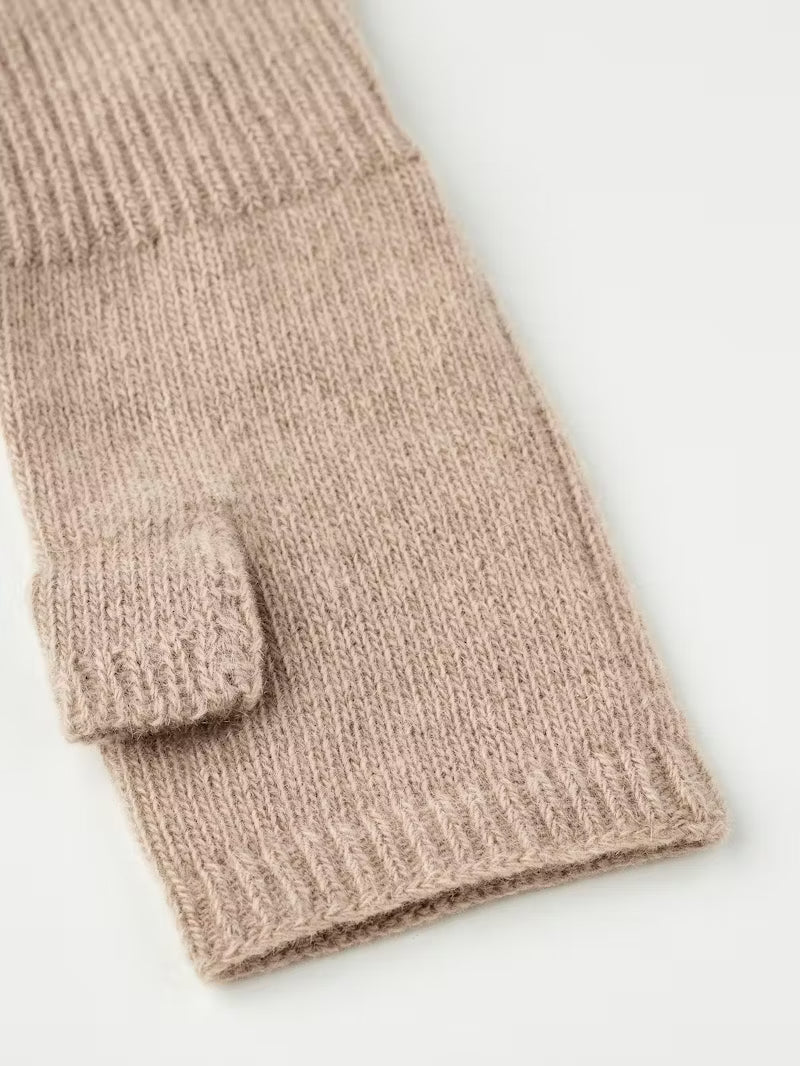 En strikket håndledsvarmer i det blødeste cashmeregarn med en bred, ribbet manchet. Et tidløst og smukt udført modetilbehør med en eksklusiv følelse. Let og varm til forår og tidligt efterår, og kan bæres over en tyndere læderhandske for at variere dit look.