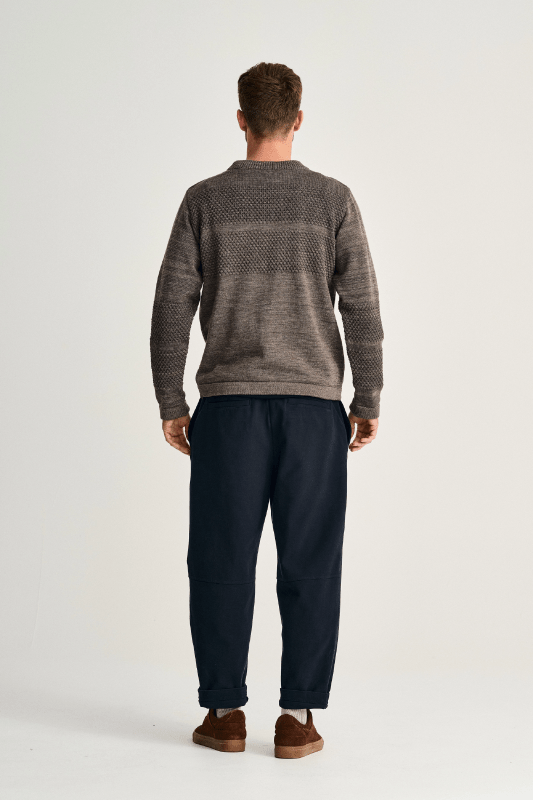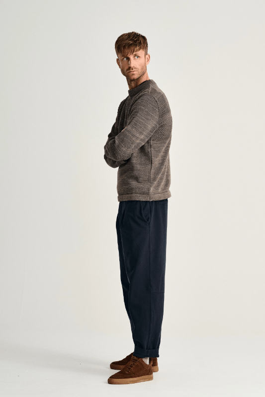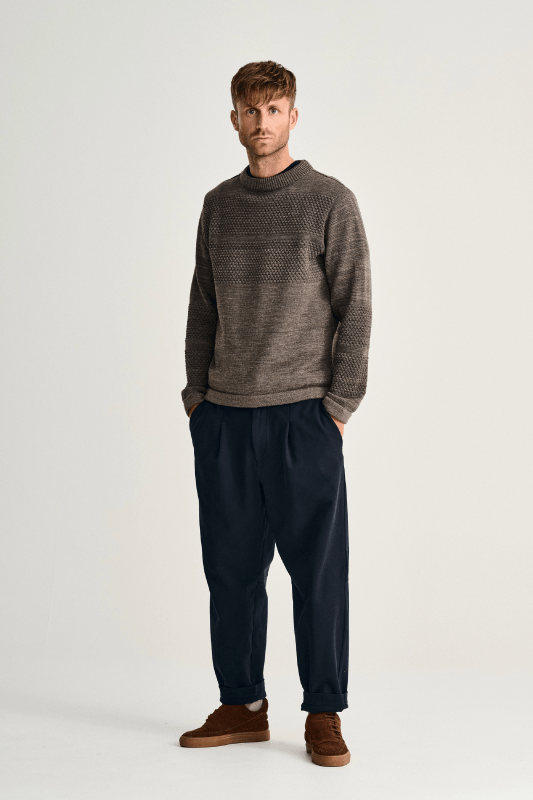 Strikket i 100% ren ny uld, kombinerer den både groft og fint strik for at skabe en unik tekstur og en slidstærk sweater, der holder dig varm hele vinteren.