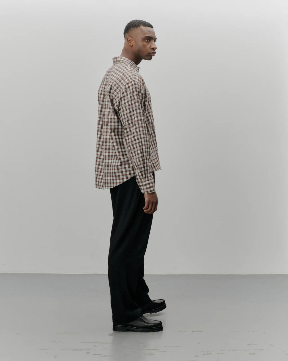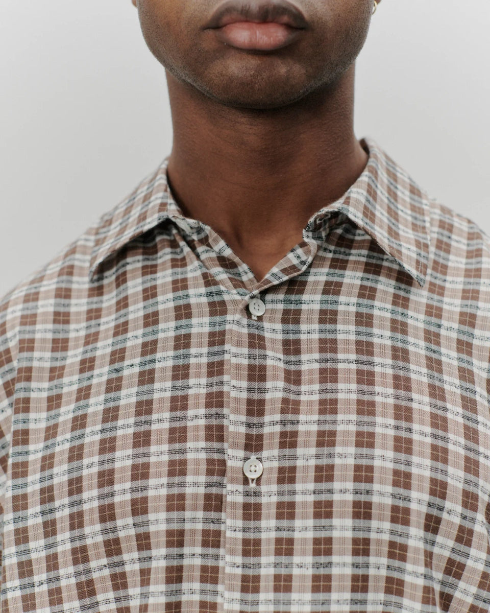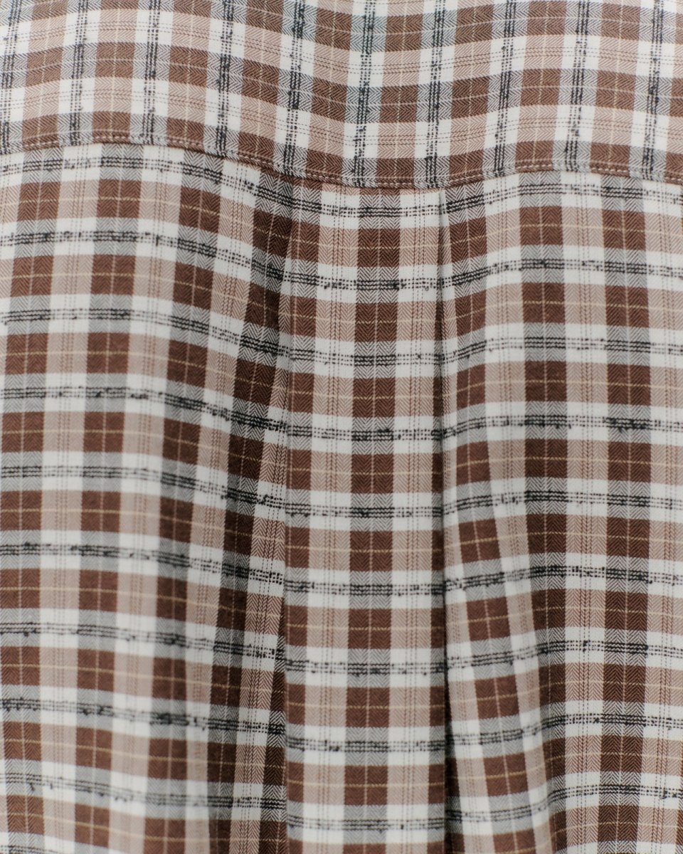 En skjorte lavet af et let 102 GSM bouclé-vævet stof. Et brunt/sort/hvidt portugisisk dødstockstof med en let tekstureret garnfornemmelse. Denne specielle bouclé-vævning giver stoffet et ujævnt udseende. I en afslappet pasform med let forlænget ryg. Med perlemorsknapper, spredt krave og en fransk foldestolpe.