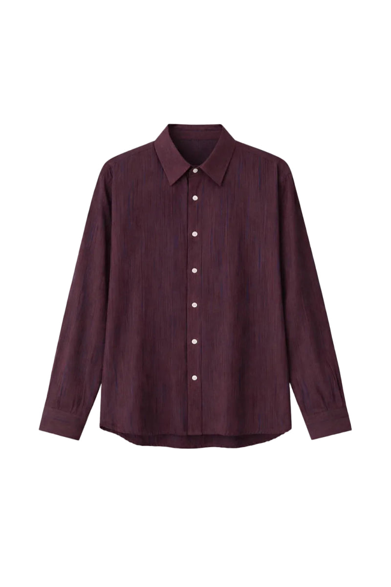 En skjorte lavet af et struktureret vævet bomuldsstof på 155 GSM. Et lilla portugisisk dødstofstof med bløde, strukturerede marineblå striber. I en afslappet pasform med let forlænget ryg. Med perlemorsknapper, spreadkrave og fransk foldestolpe.