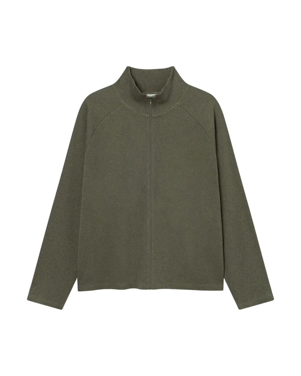 Vous Décidez Text Zip Army Green Rib er en komfortabel og afslappet track top i army grøn ribstrikket stof, lavet af blødt og elastisk deadstock-bomuld. Toppen har en relaxed fit, høj funnel-neck og tonal YKK-lynlås, perfekt til både sporty og casual outfits.