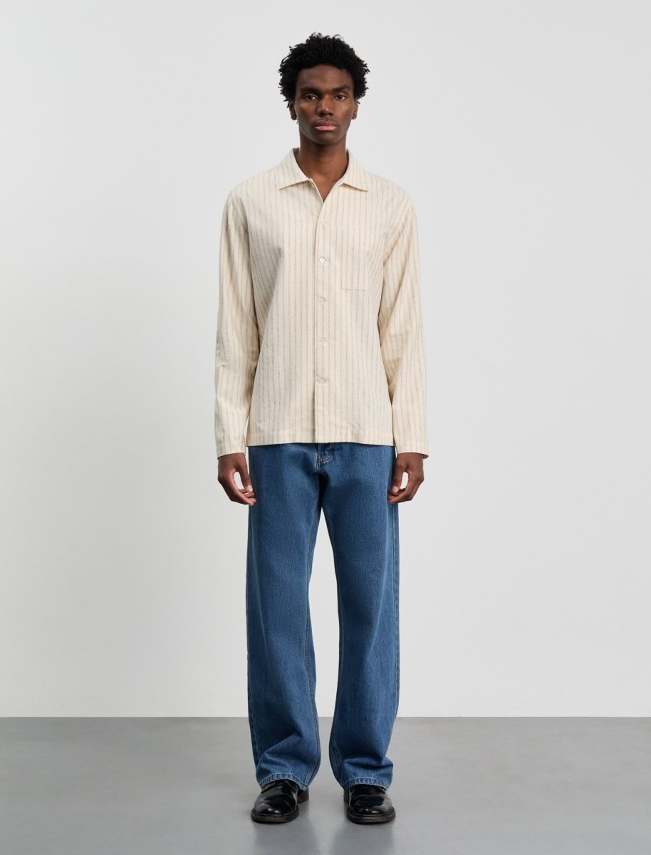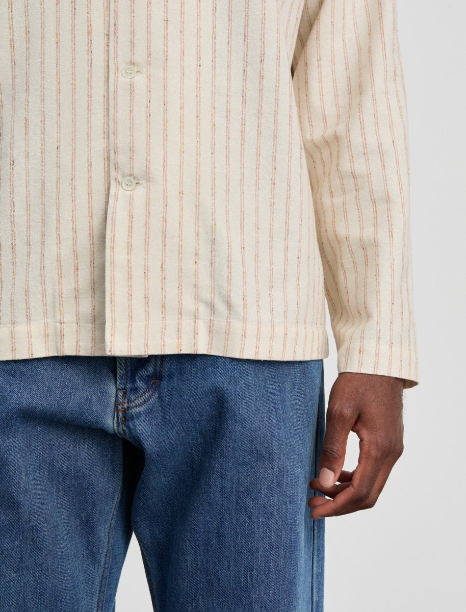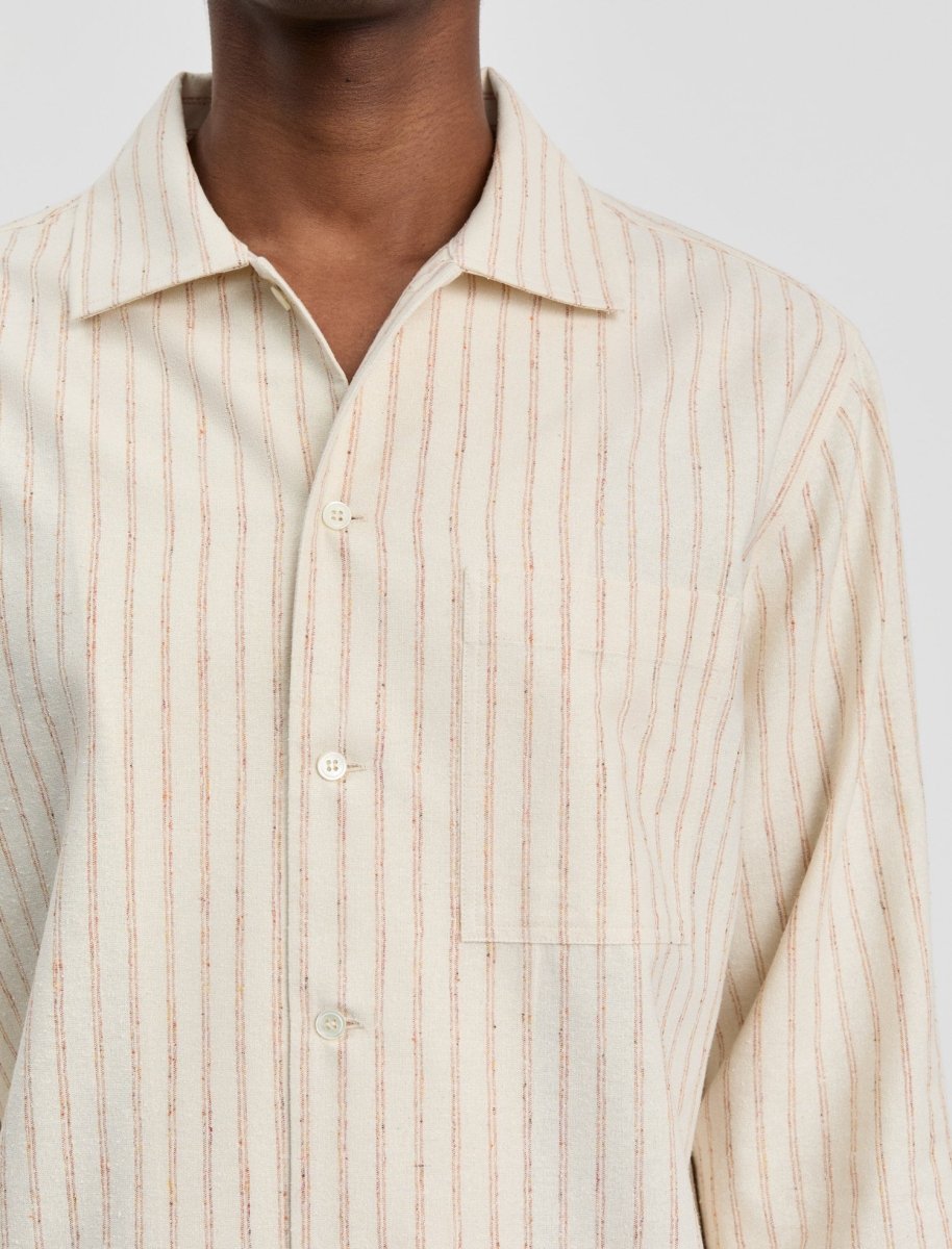 Oplev ANOTHER ASPECT Shirt 2.1 Gold Stripe, en kortærmet skjorte inspireret af Hemingways Cuba, skabt til afslappet og stilfuld hverdagsbrug. Denne version lader det bløde silkeblanding-stof tale for sig selv uden knapper på manchetter eller krave.