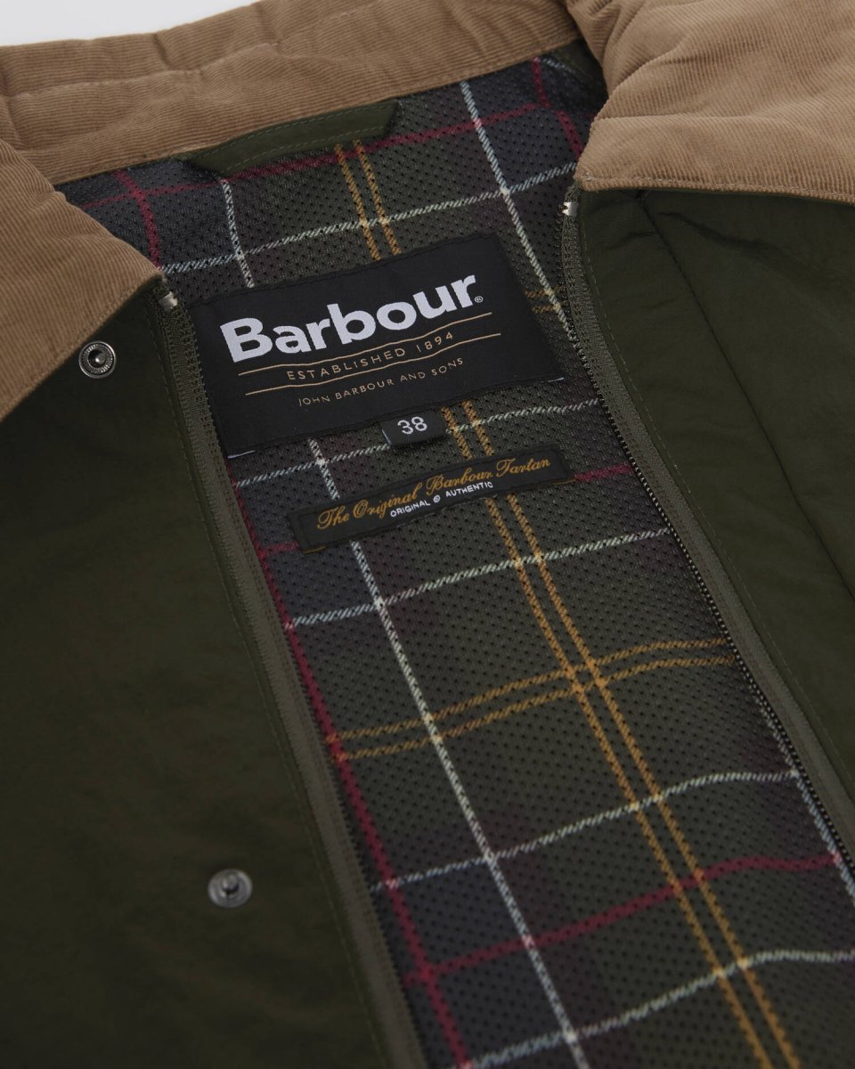 Jakken er udstyret med baby cord-krave, lynlåslukning med trykknapstolpe, skrålommer, elastiske manchetter og justerbar snøre i bunden. Indvendige tartan-detaljer og tonal Barbour-brodering på venstre lomme fuldender det ikoniske udtryk.