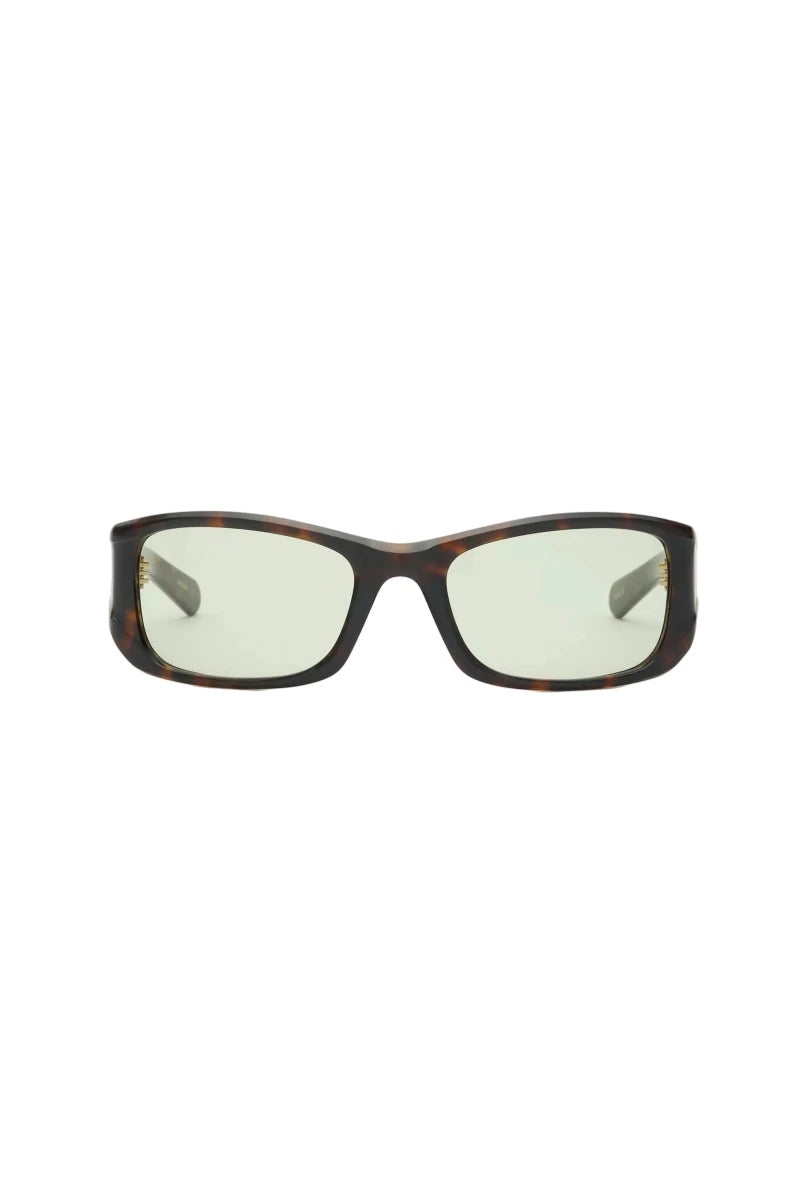 Drift i Dark Tortoise kombinerer en markant, rektangulær silhuet med varme nuancer og moderne attitude. Det dybe tortoise-stel giver et sofistikeret og eksklusivt udtryk, mens de grønne “Chill Out” linser tilfører karakter og kant.