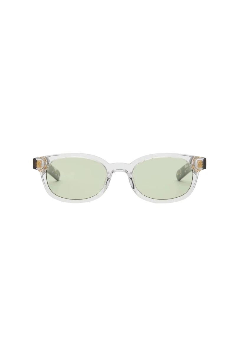 Minimalistiske solbriller fra FLATLIST med transparent krystalstel og grønne “Chill Out” linser. Modellen kombinerer et skarpt, moderne udtryk med let komfort, hvilket gør dem perfekte til både hverdagsbrug og sommerdage i solen.