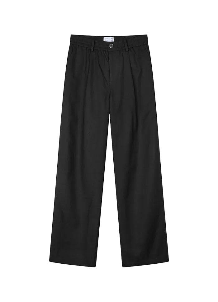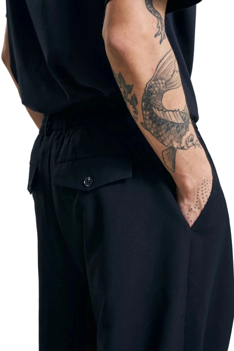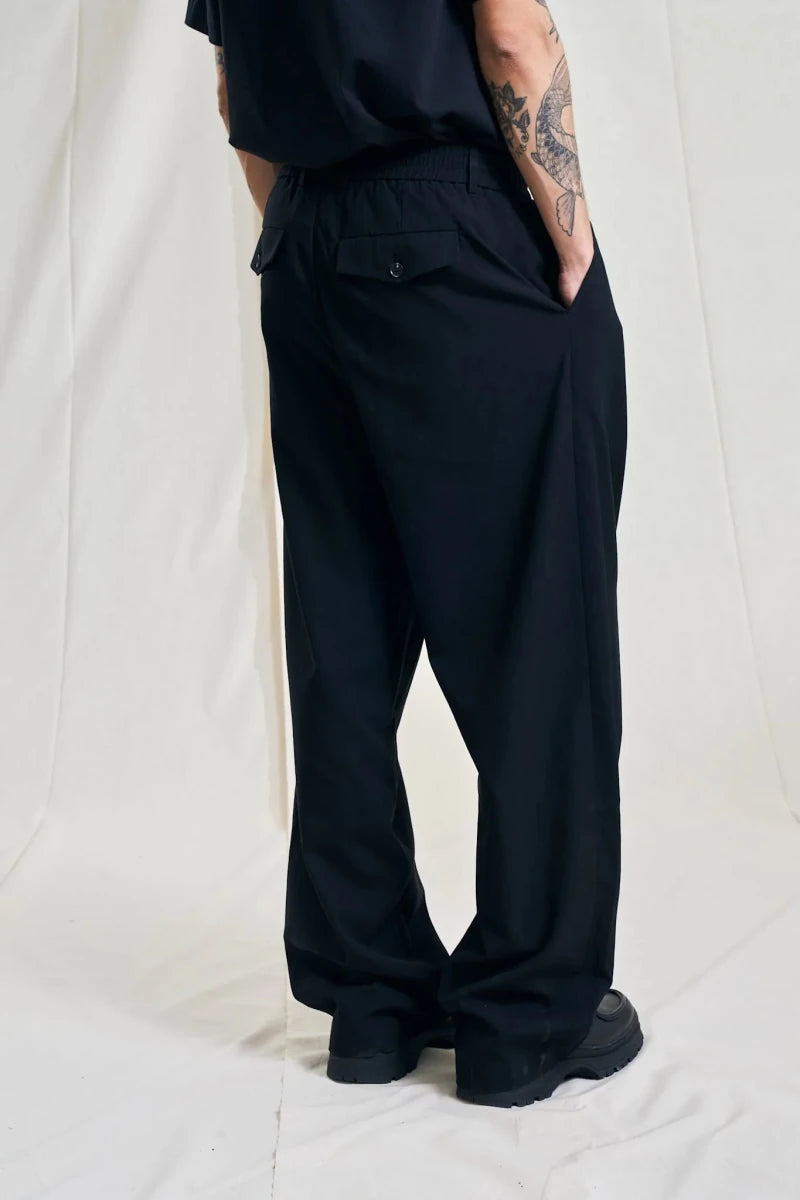 Voluminøs, bred og lang pasform med elastisk linning, baglommeflapper og gennemsigtige knapper for et rent udtryk.