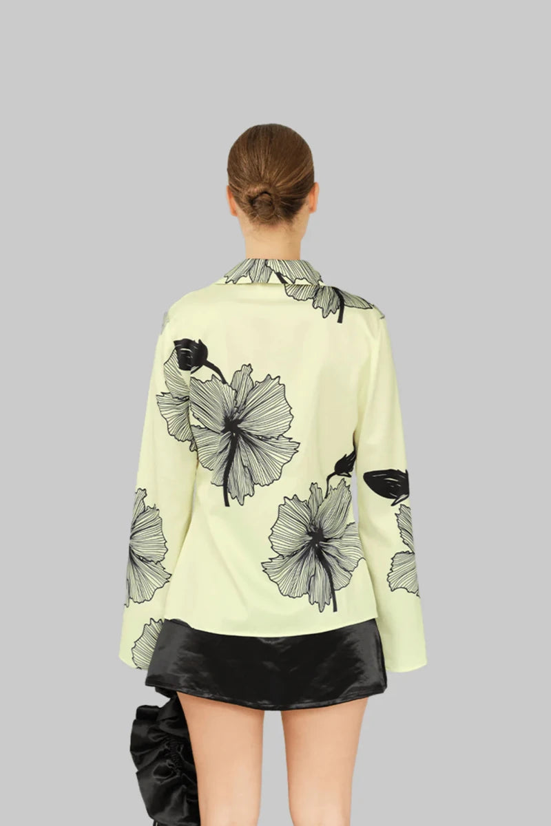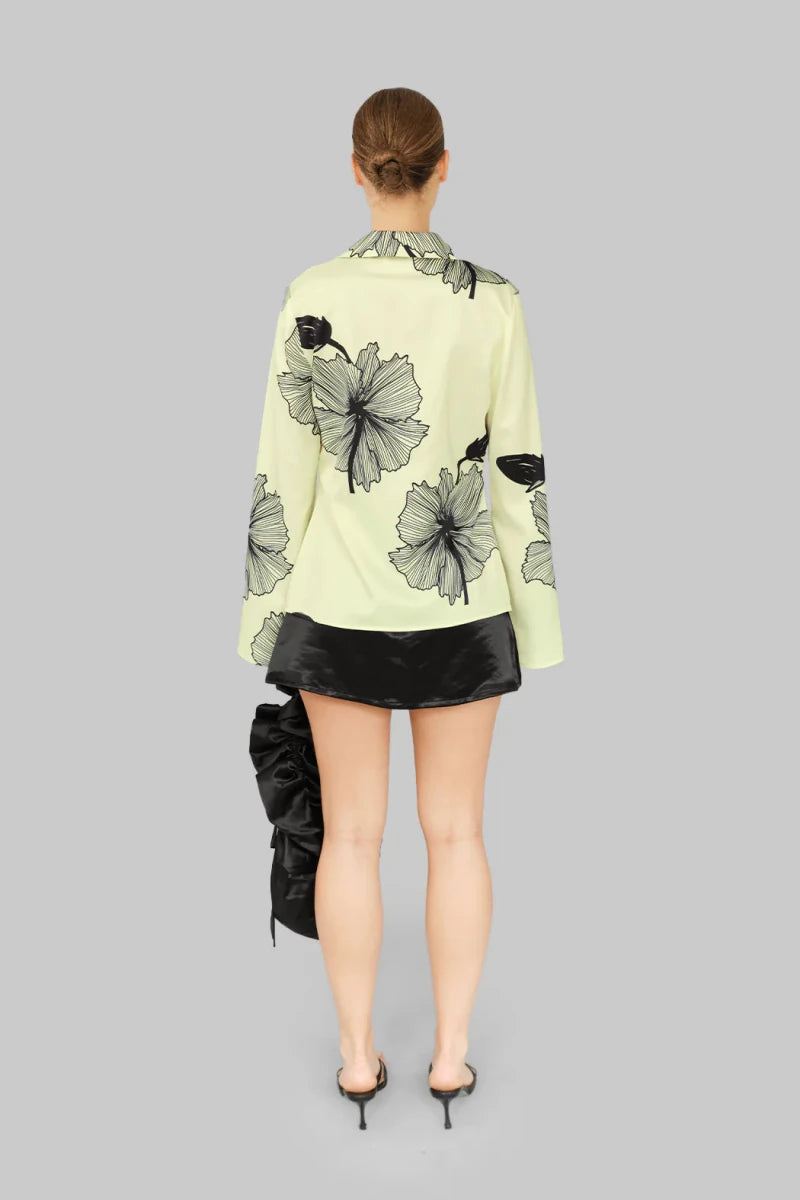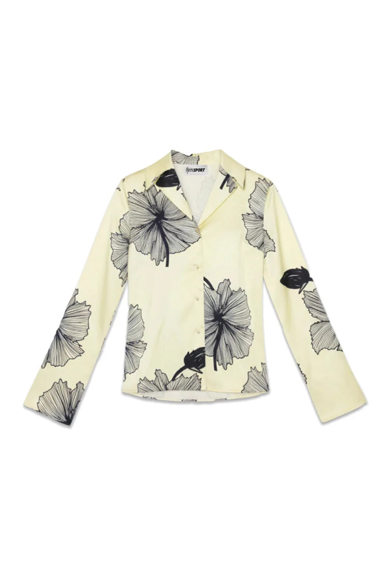 Lone Shirt er fremstillet i 100% genanvendt polyester i en blød gul nuance med markante sorte blomsterprints. Den afslappede, let oversized pasform giver et ubesværet og moderne udtryk, mens de lange klokkeærmer tilfører bevægelse og karakter.