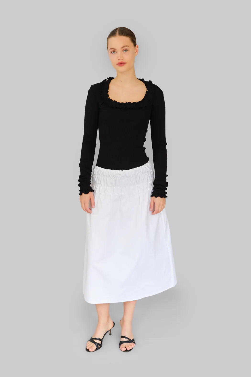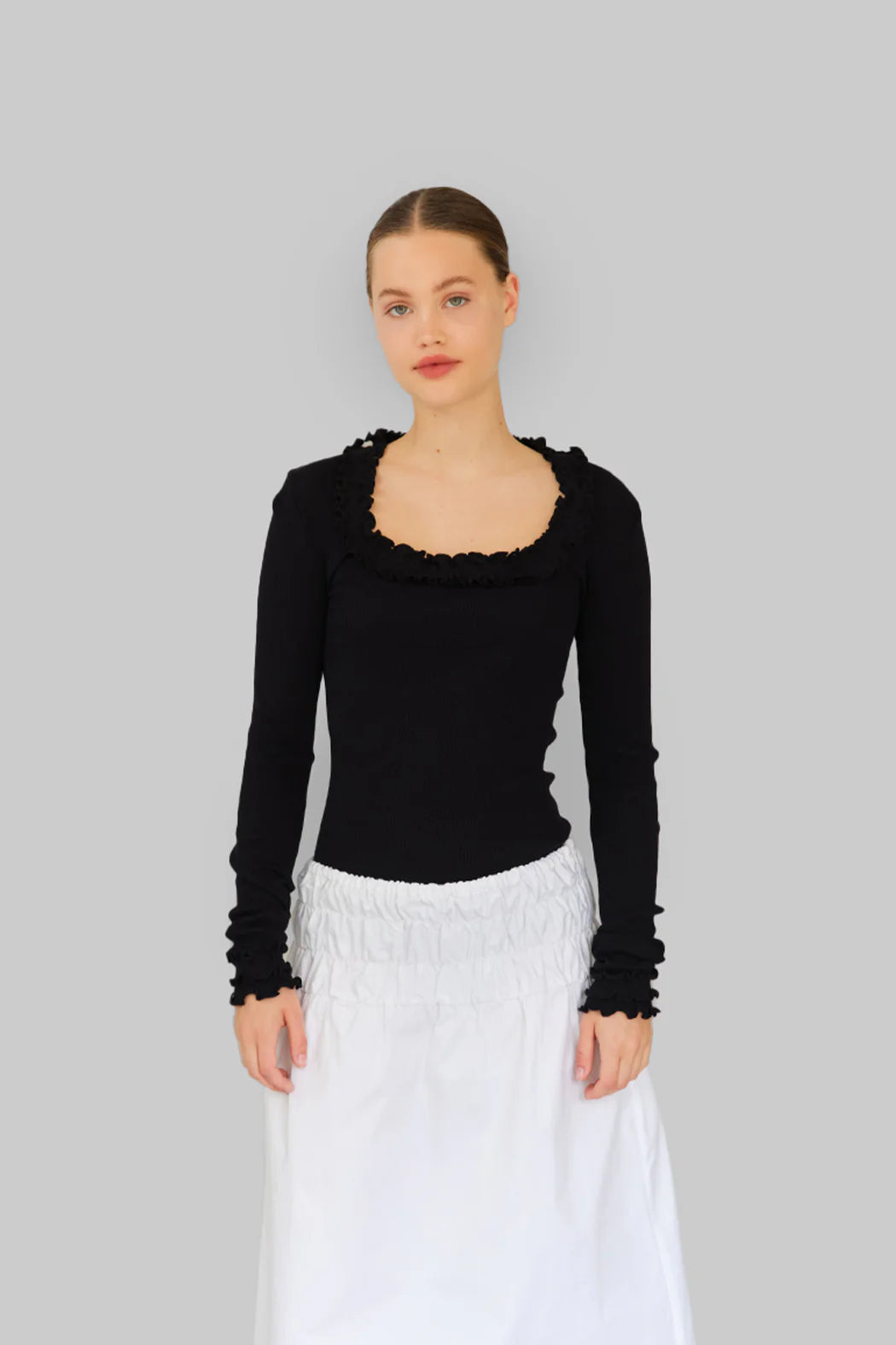 Den åbne, firkantede udskæring giver et moderne og feminint udtryk, mens den sorte flæsekant, der løber fra halsudskæringen og ud til ærmeafslutningerne, tilfører et sofistikeret og karakterfuldt finish.