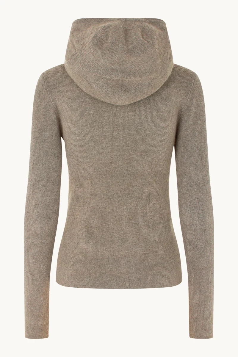 - Detaljer: Ribstrikket struktur, integreret hætte, lange ærmer