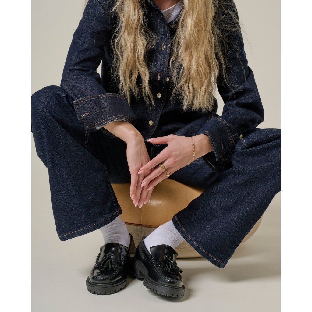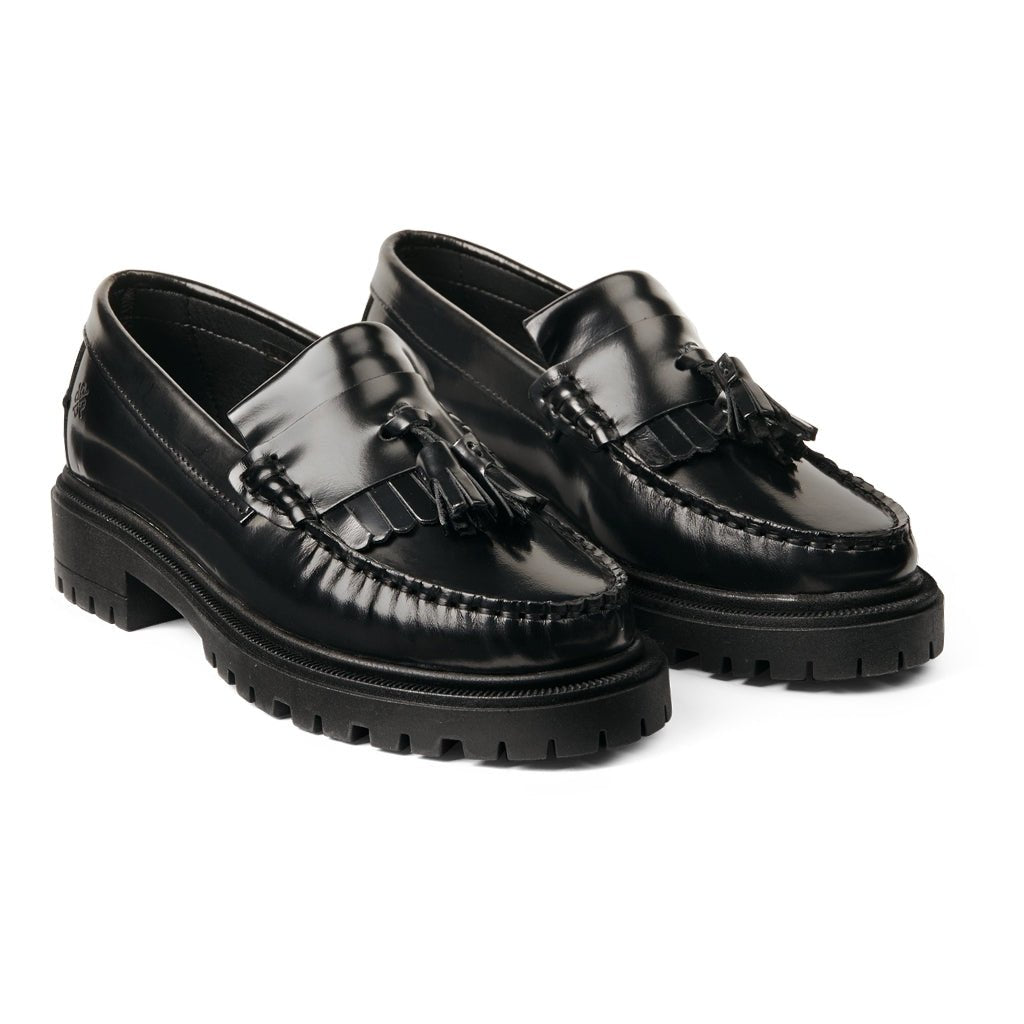Oplev sofistikeret stil med Playboy The Lula Loafers i en klassisk sort polido-læder finish. Disse loafers kombinerer tidløst design med moderne komfort, fremhævet af de elegante frynser og kvastdetaljer. Den bløde, mellemhøje gummisål sikrer behagelig støtte hele dagen, mens de håndsyede, åbne moccasinsyninger giver et eksklusivt touch. Med en komfortabel læderindlægssål, tilbyder disse sko både stil og funktionalitet.