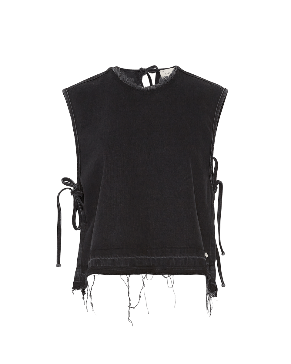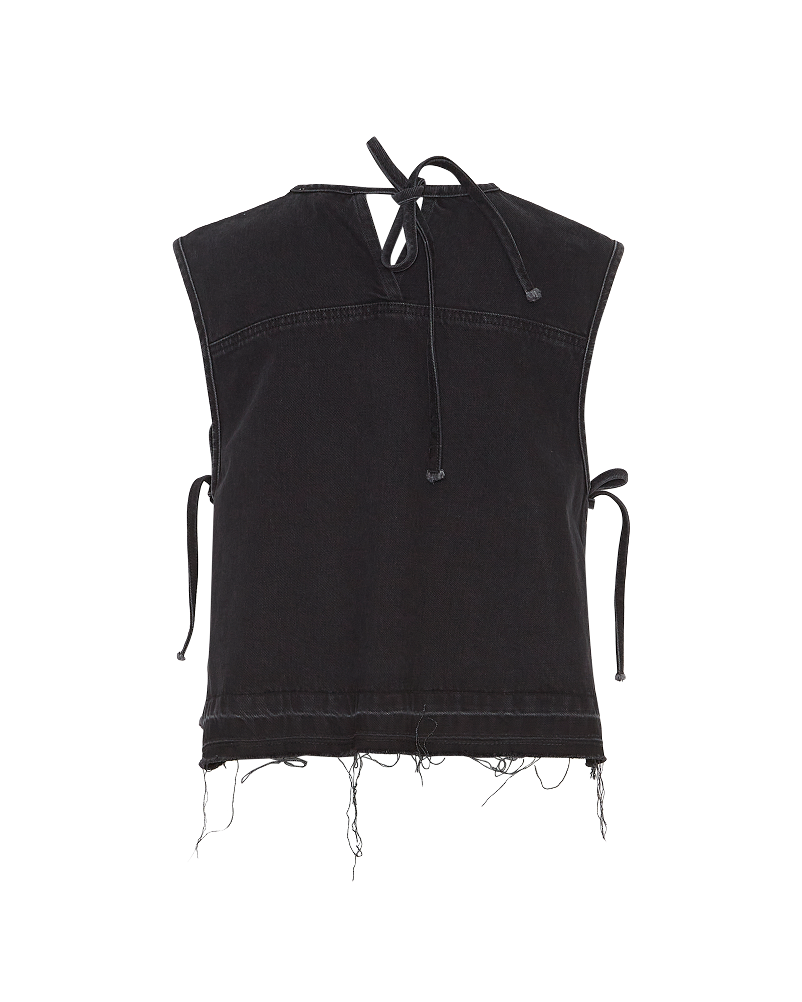 En rå og moderne top med et markant, denim-inspireret udtryk. Black Lagos-modellen er skabt i en blød, vasket metervare, der giver et autentisk, slidt look uden at gå på kompromis med komforten. Den boxy, ærmeløse silhuet kombineret med rå kanter og bindebånd i siderne skaber en stærk, karakterfuld form, der både kan styles afslappet og mere edgy.