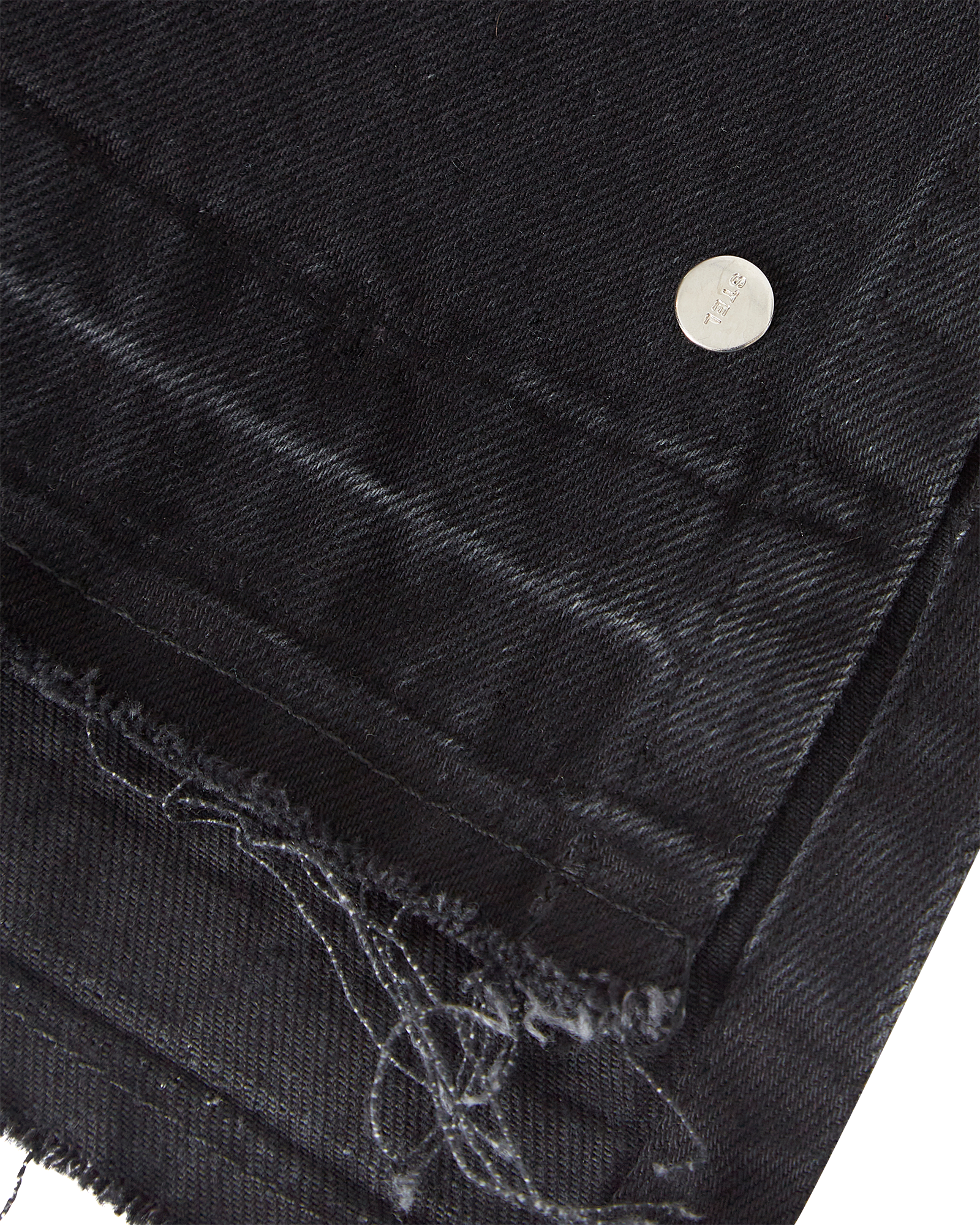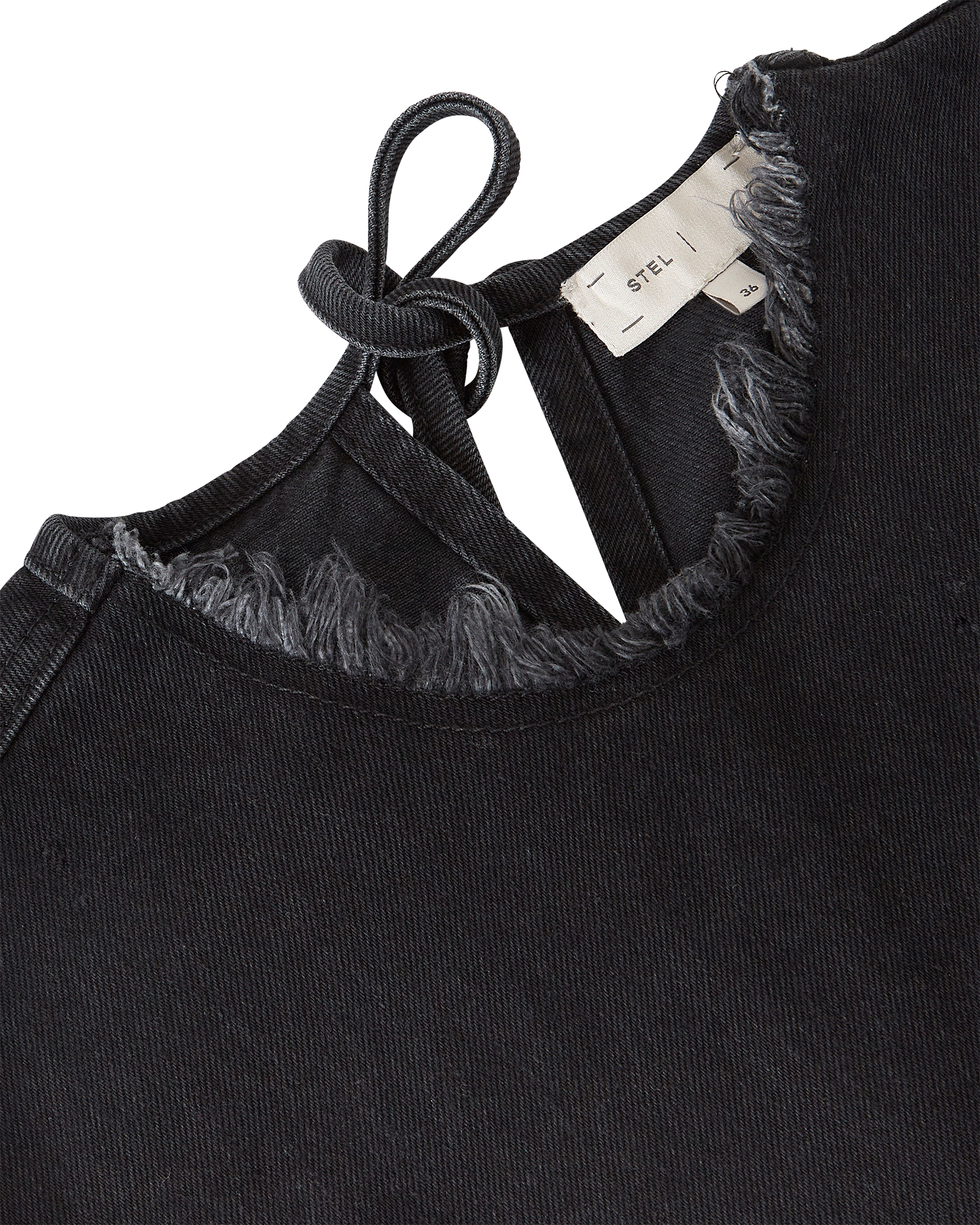 Toppen har et diskret åbent ryg-design med bindelukning i nakken, som tilføjer et feminint twist til det ellers robuste design. De flossede detaljer langs halsudskæringen og den løse, asymmetriske bund giver en unik struktur, der gør Black Lagos til et standout-piece i enhver garderobe.