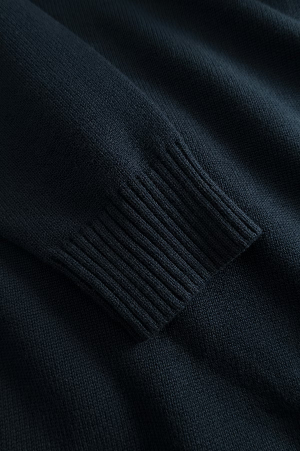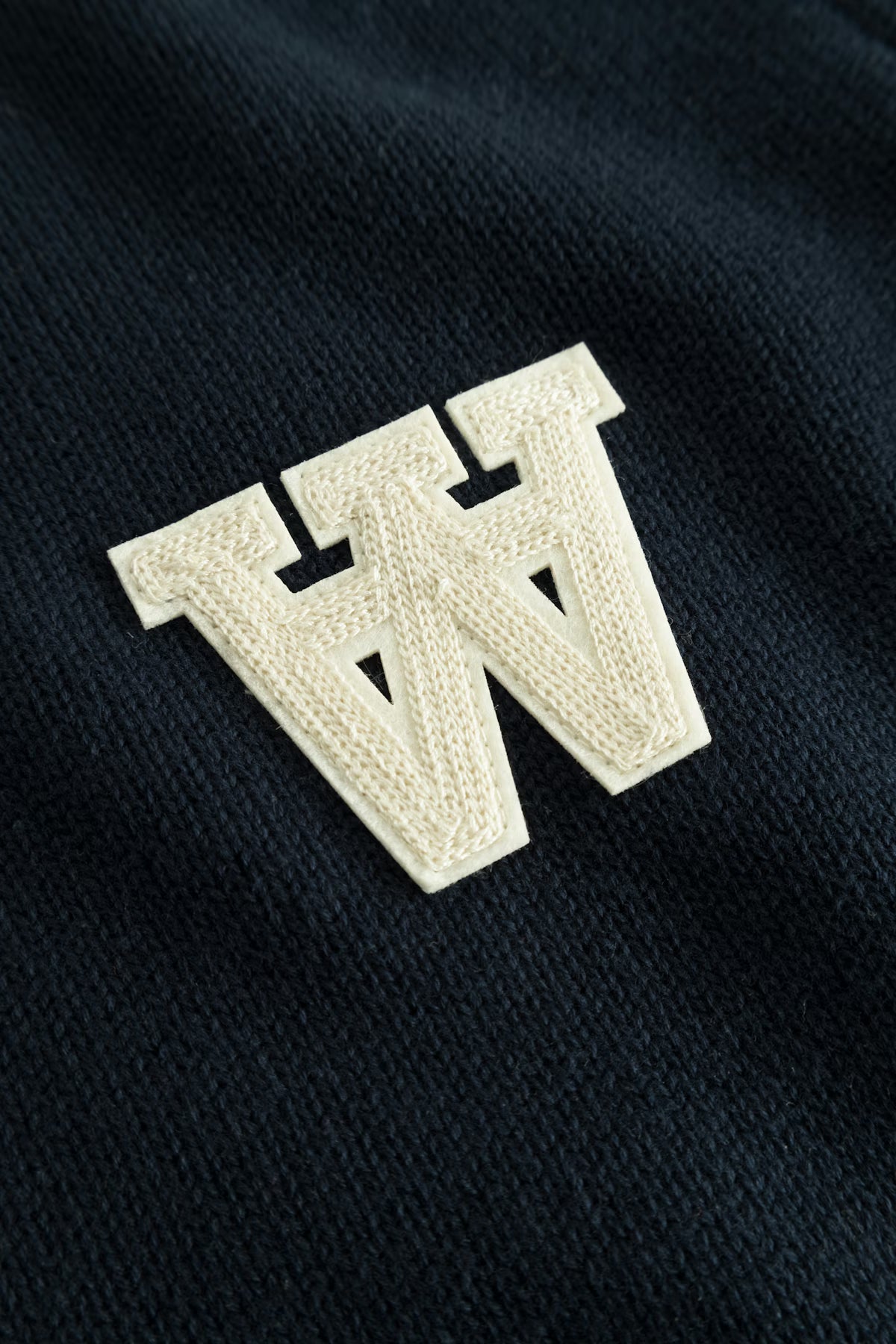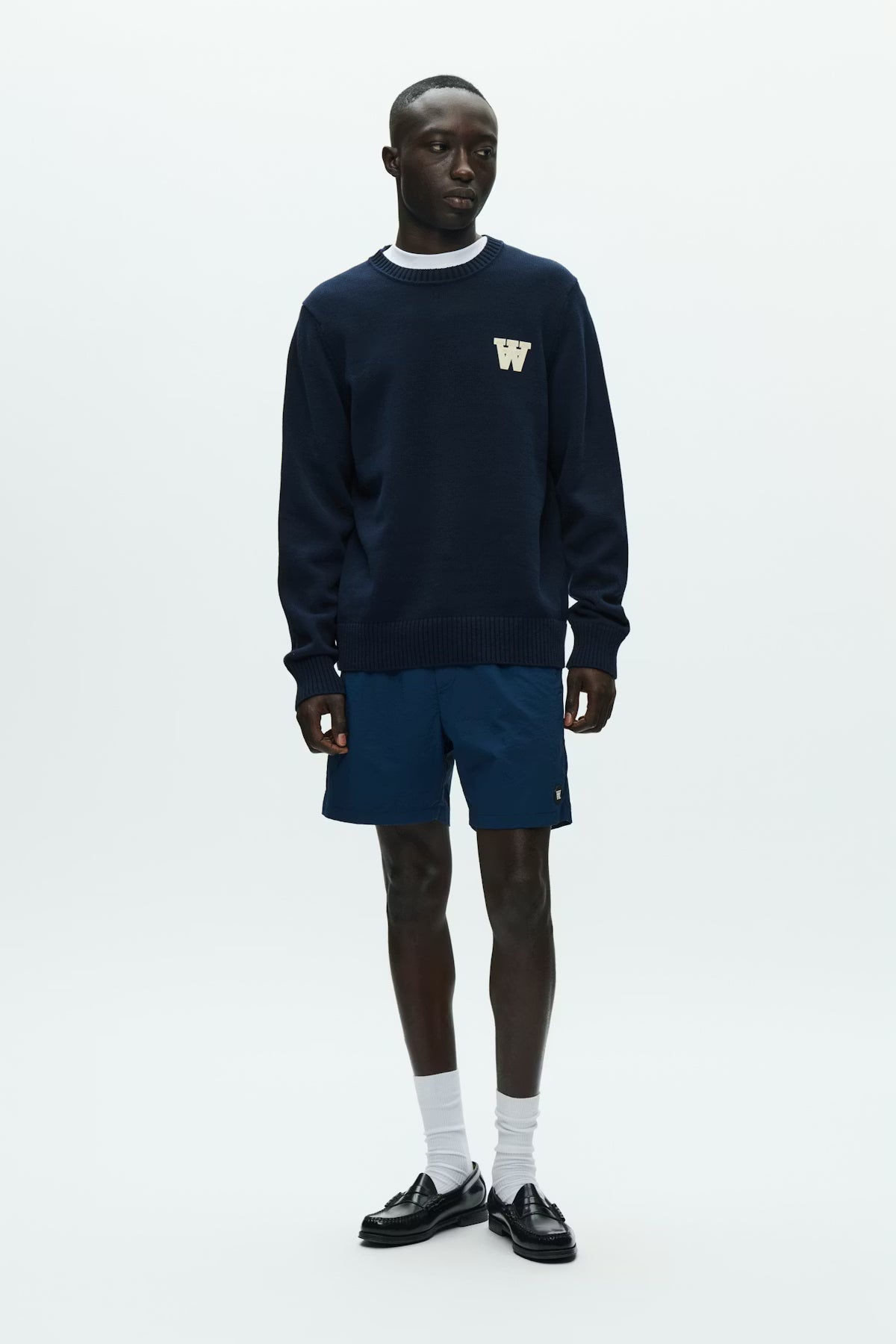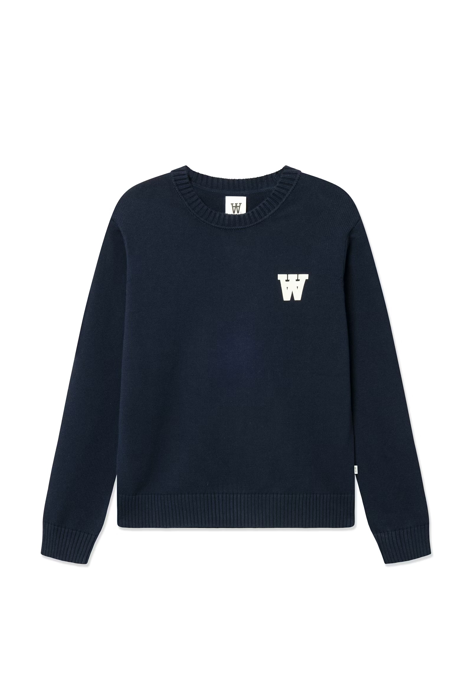 Pulloveren har regular fit og er afsluttet med ribkanter ved hals, ærmer og bund. Det ikoniske Wood Wood-logo på brystet giver et diskret, sporty touch, mens farven Dark Navy gør den alsidig og nem at style i både casual og mere opklædte looks.